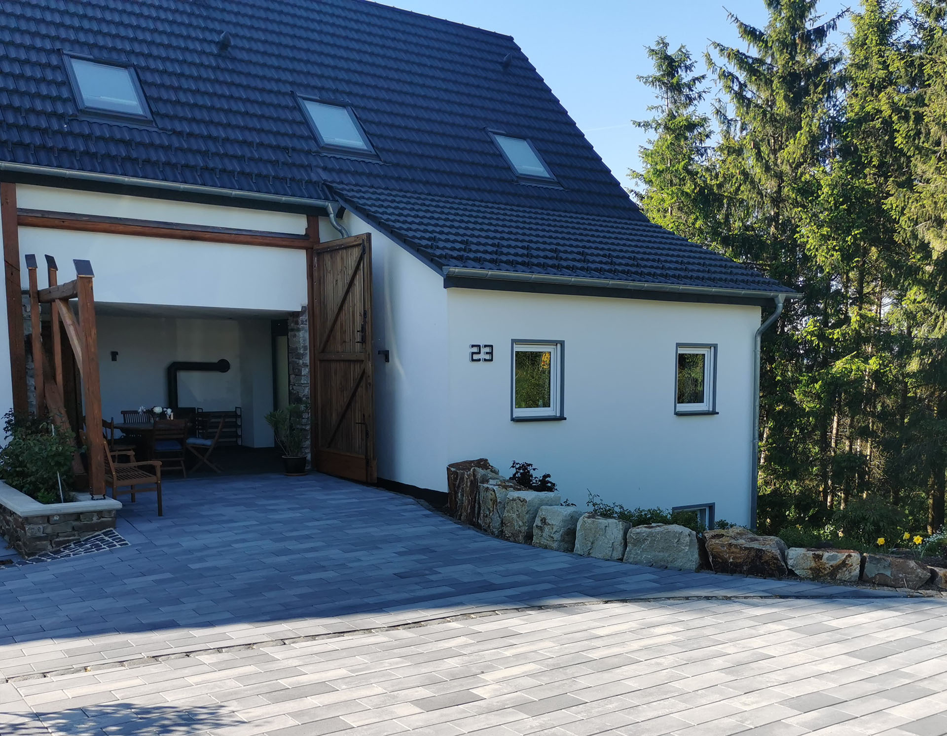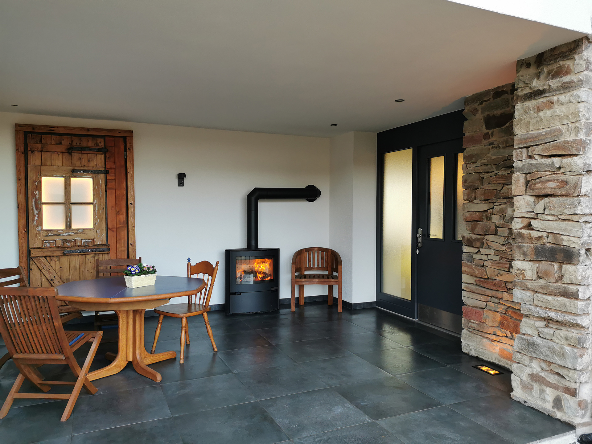 Genießen Sie eine 15 m² große überdachte Terrasse, die vor Wind und Wetter geschützt ist und am Morgen einen stimmungsvollen Sonnenaufgang bietet. Ausgestattet mit einem Holzkaminofen und Gasgrill bietet sie ganzjährigen Komfort. Die rustikalem Terrassenmöbel laden zum Verweilen ein, während der Grill duftet und ein leckeres Getränk für stimmungsvolle Momente sorgt.