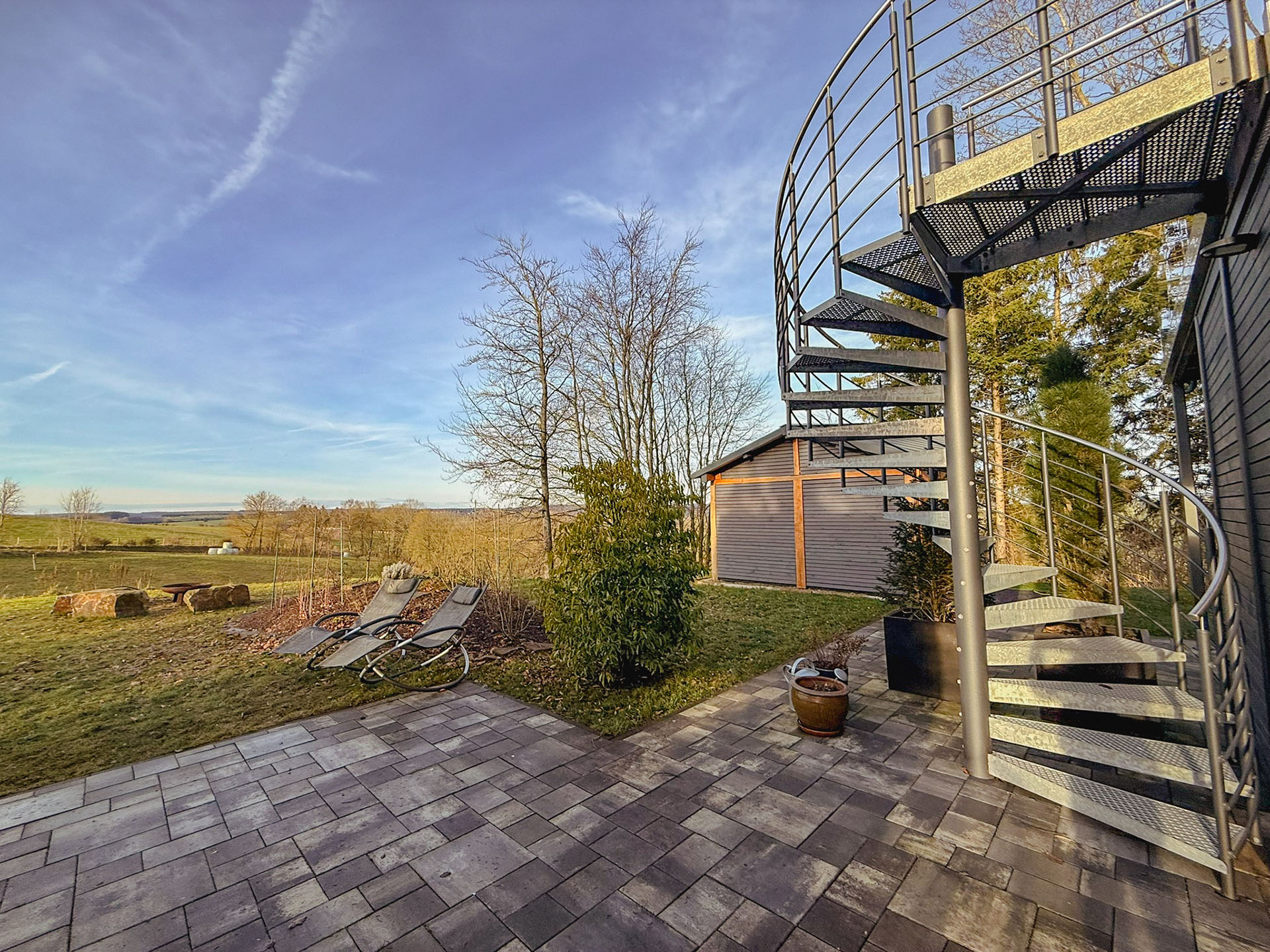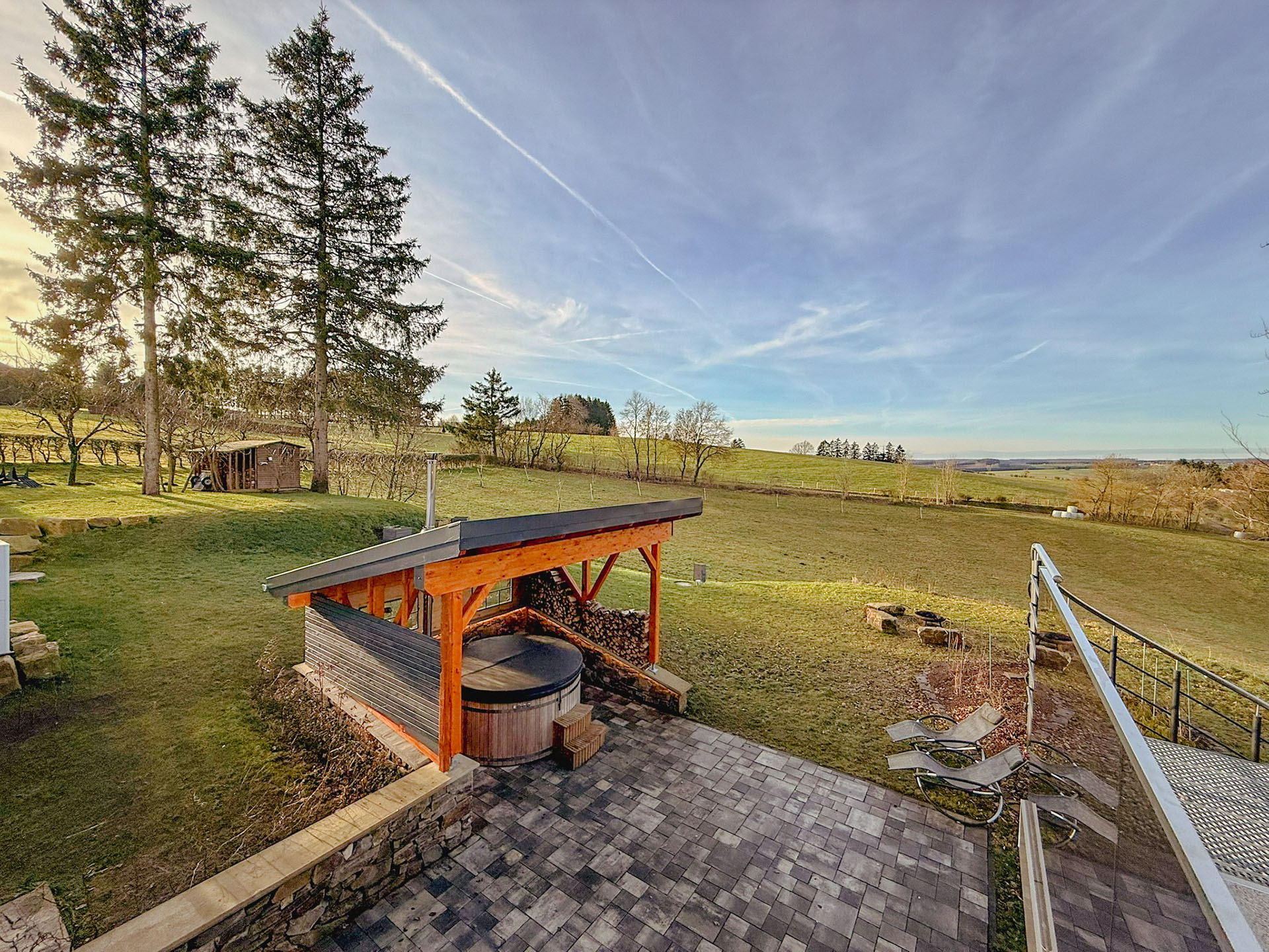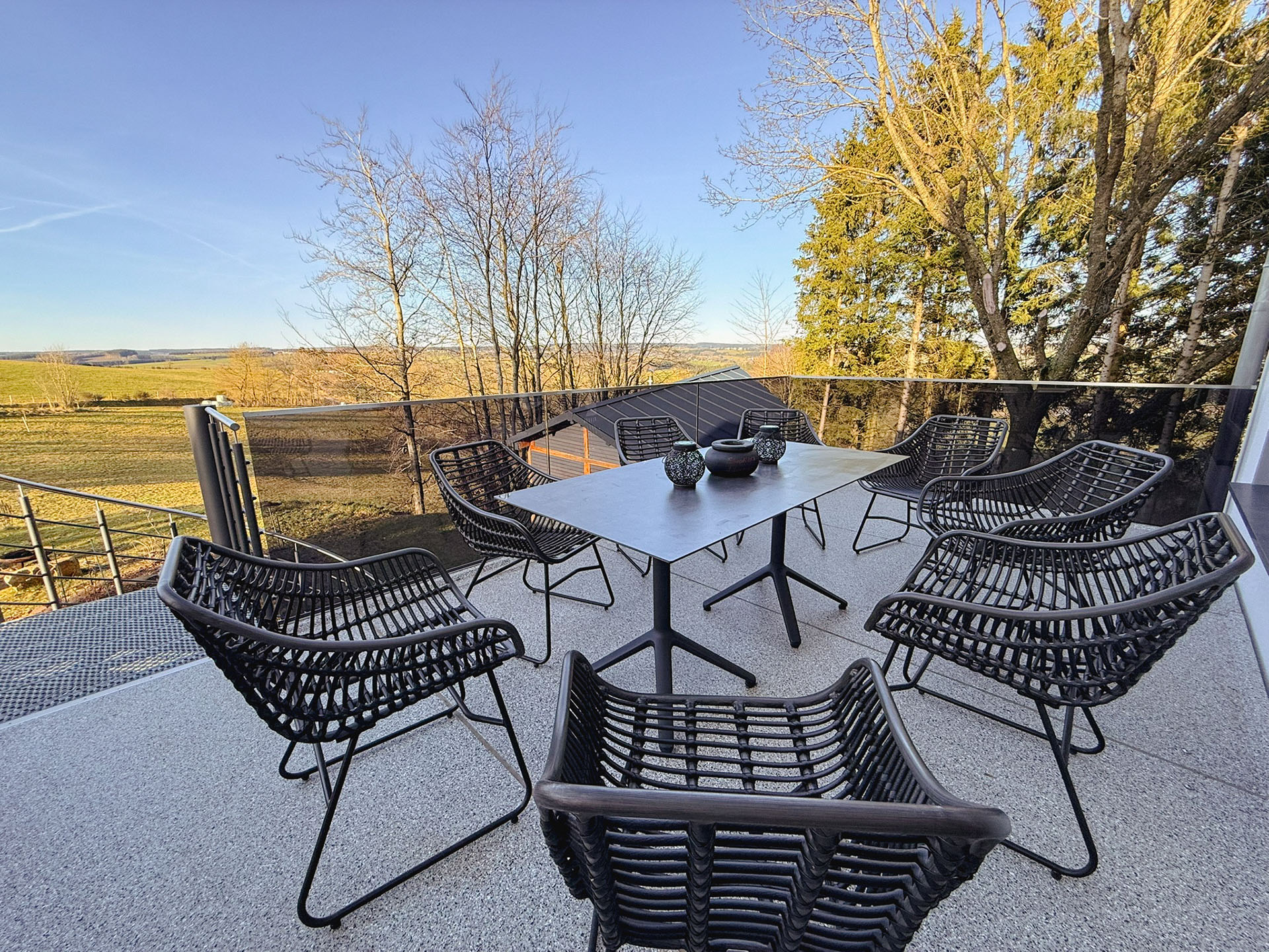 Der 15 m² große Balkon mit edlen Glasgeländer schützt vor Wind und gibt den Blick frei Richtung Westen, über die neu bepflanzte Streuobstwiese und grasende Kühe vom Bio-Bauern im Sommer bis zum Horizont auf die Wälder der Ardennen. Die behaglichen Outdoormöbel mit Kissen und Decken laden zum Innehalten am Nachmittag ein. Sehr oft sieht man hier abends einen Sonnenuntergang mit fast surreal schönen Bildern. Hier ist auch der dunkelste und ruhigste Ort am Haus, der Sternegucken zum Erlebnis macht und wo die Milchstraße genau über dem Haus zu sehen ist.