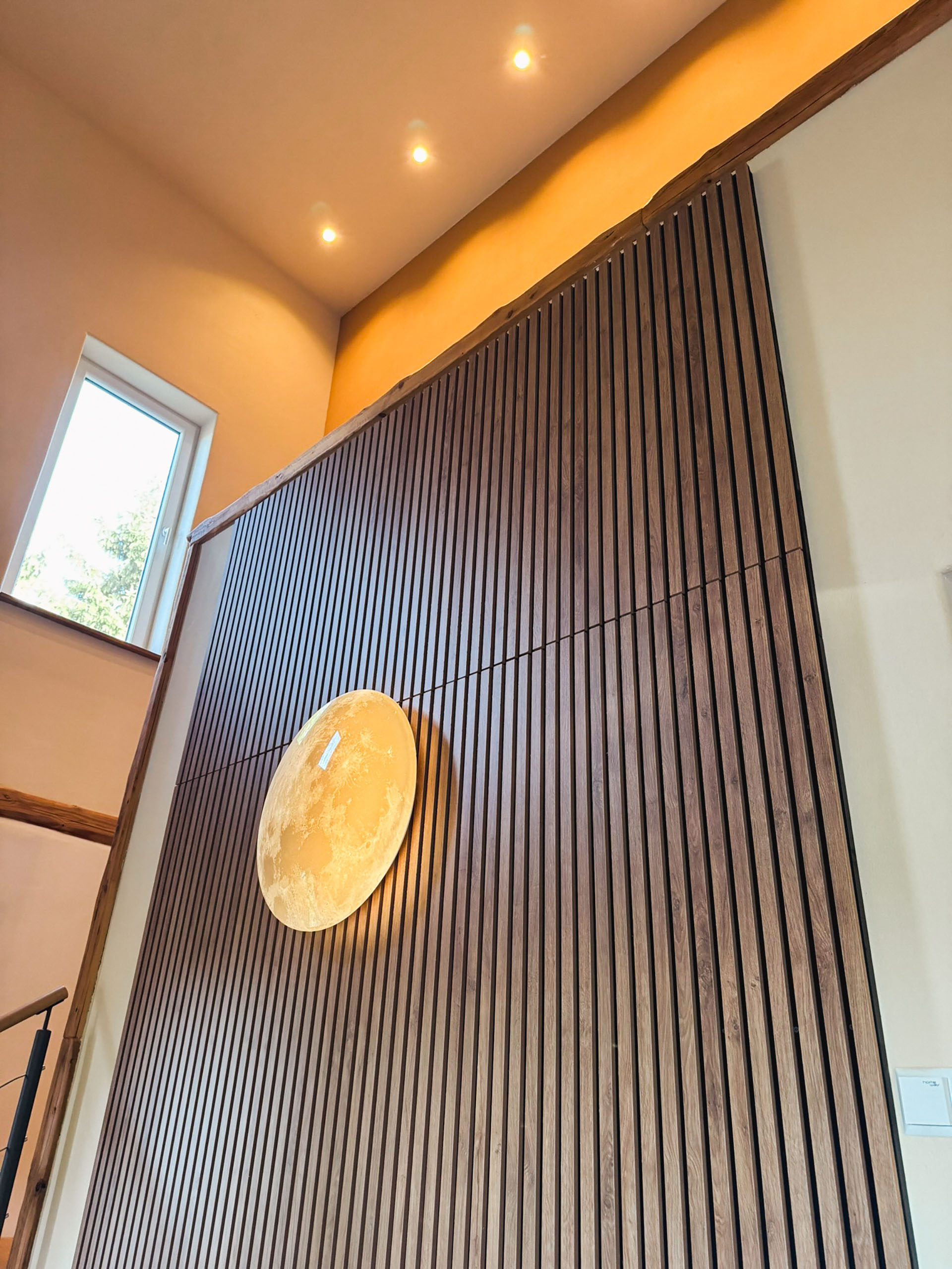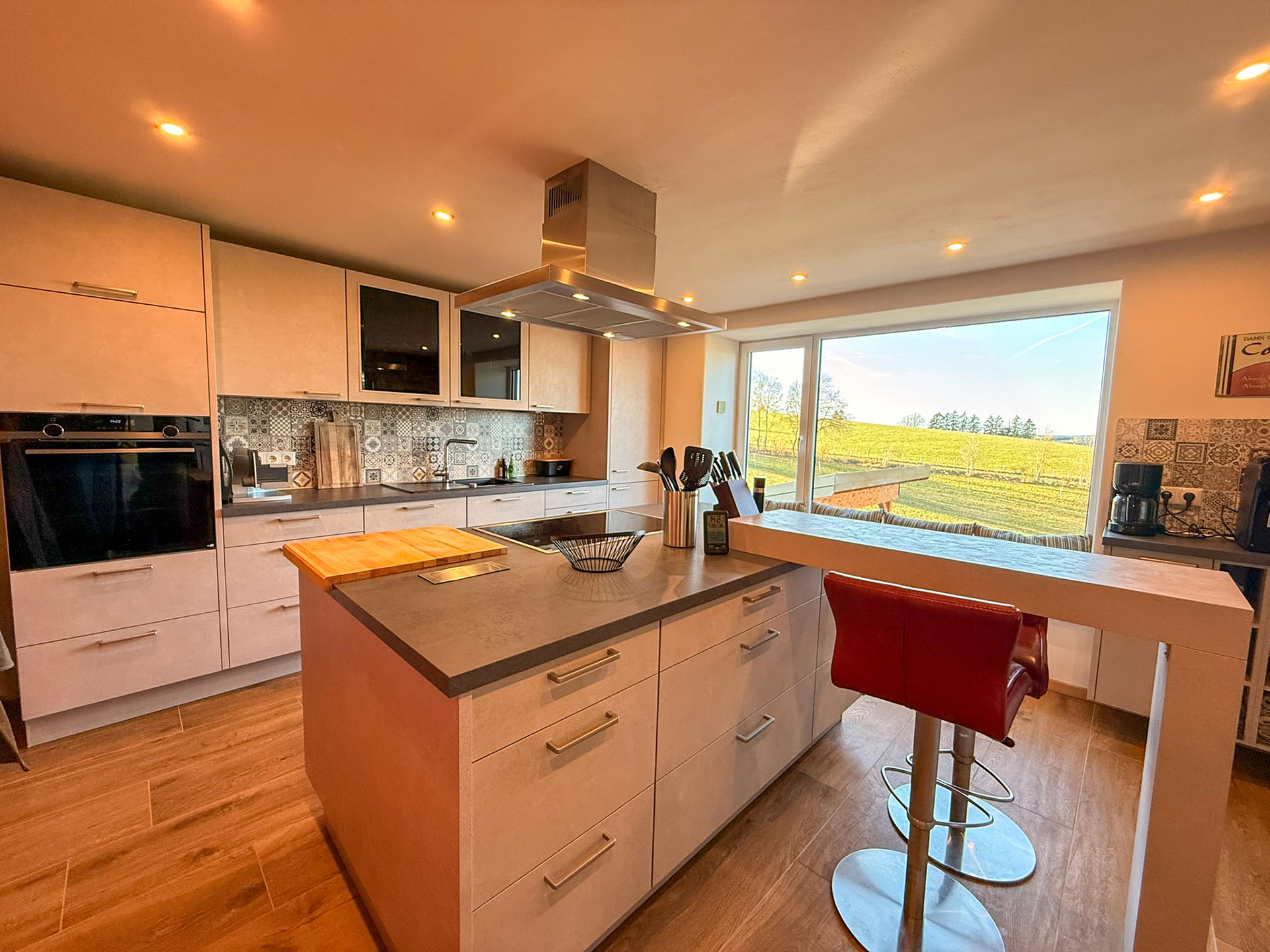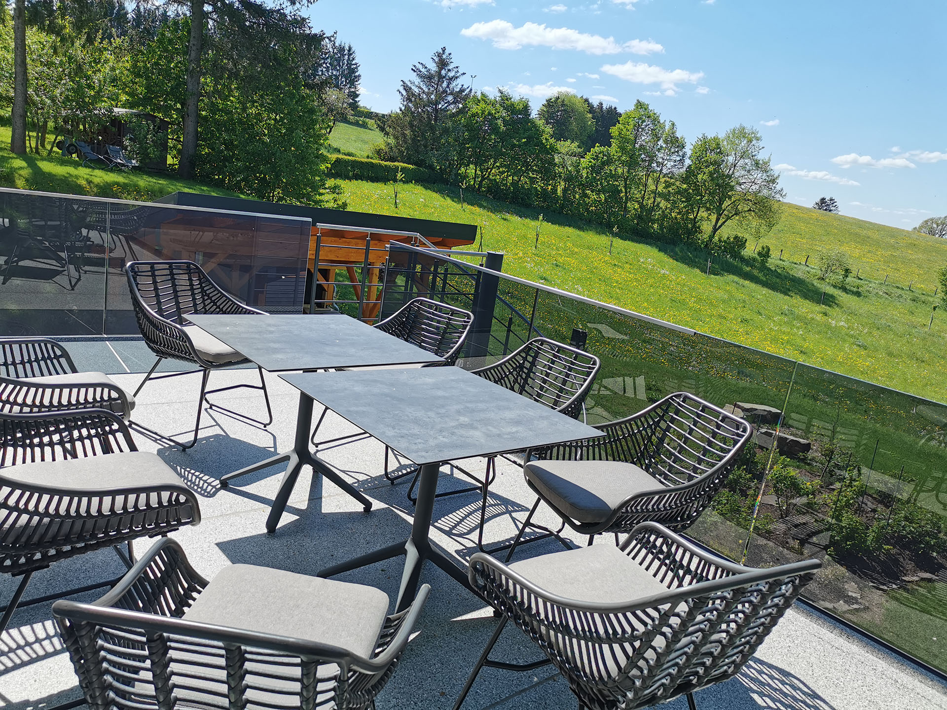Der 15 m² große Balkon mit edlen Glasgeländer schützt vor Wind und gibt den Blick frei Richtung Westen, über die neu bepflanzte Streuobstwiese und grasende Kühe vom Bio-Bauern im Sommer bis zum Horizont auf die Wälder der Ardennen. Die behaglichen Outdoormöbel mit Kissen und Decken laden zum Innehalten am Nachmittag ein. Sehr oft sieht man hier abends einen Sonnenuntergang mit fast surreal schönen Bildern. Hier ist auch der dunkelste und ruhigste Ort am Haus, der Sternegucken zum Erlebnis macht und wo die Milchstraße genau über dem Haus zu sehen ist.
