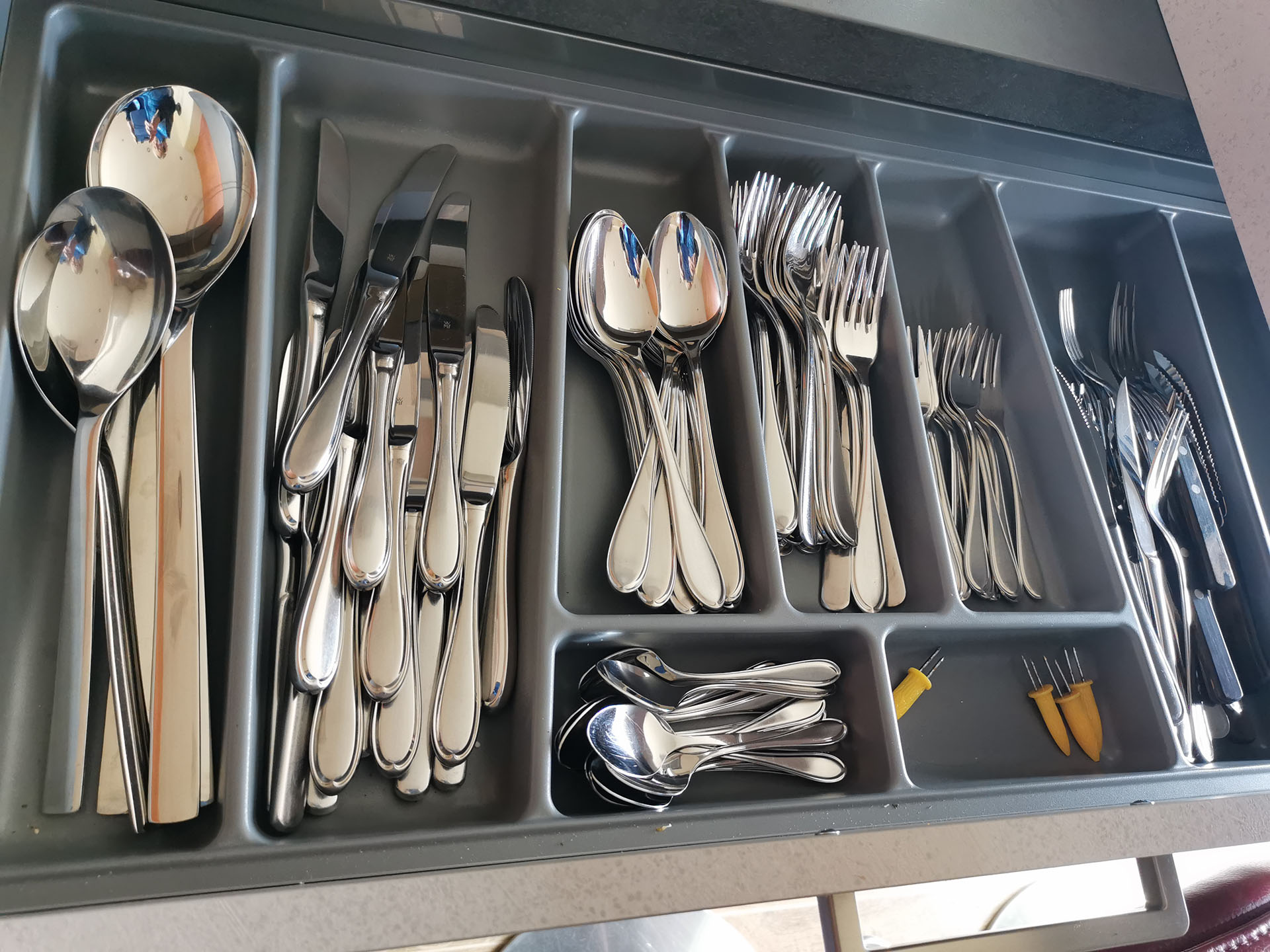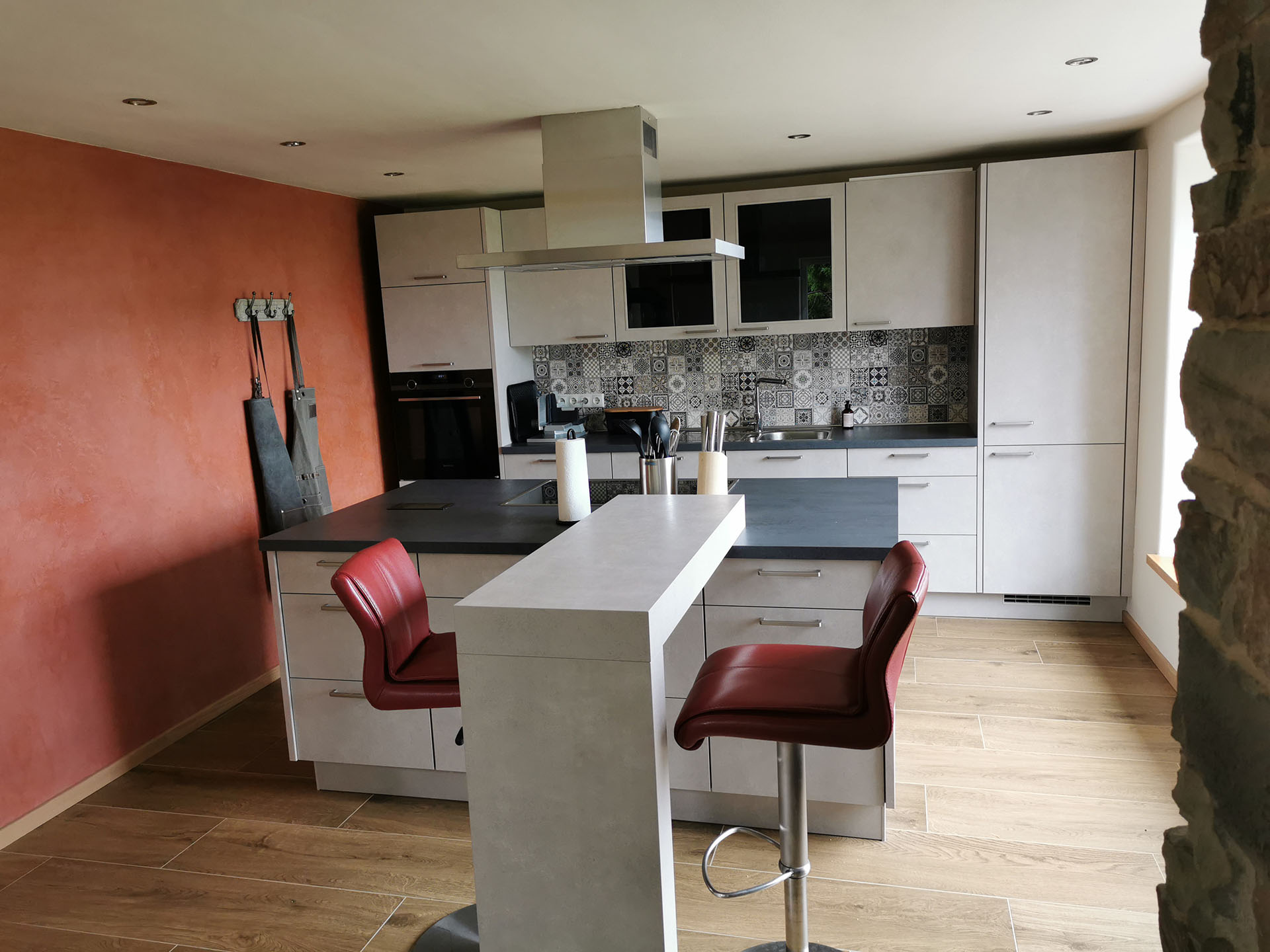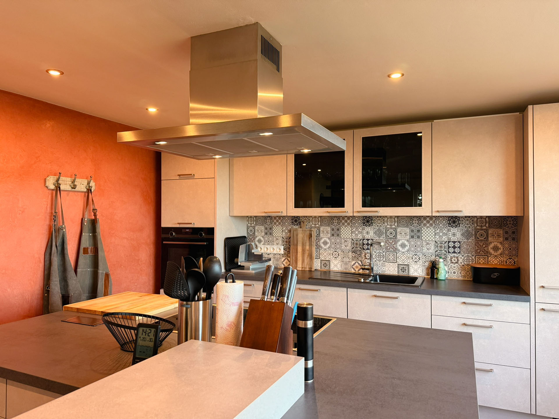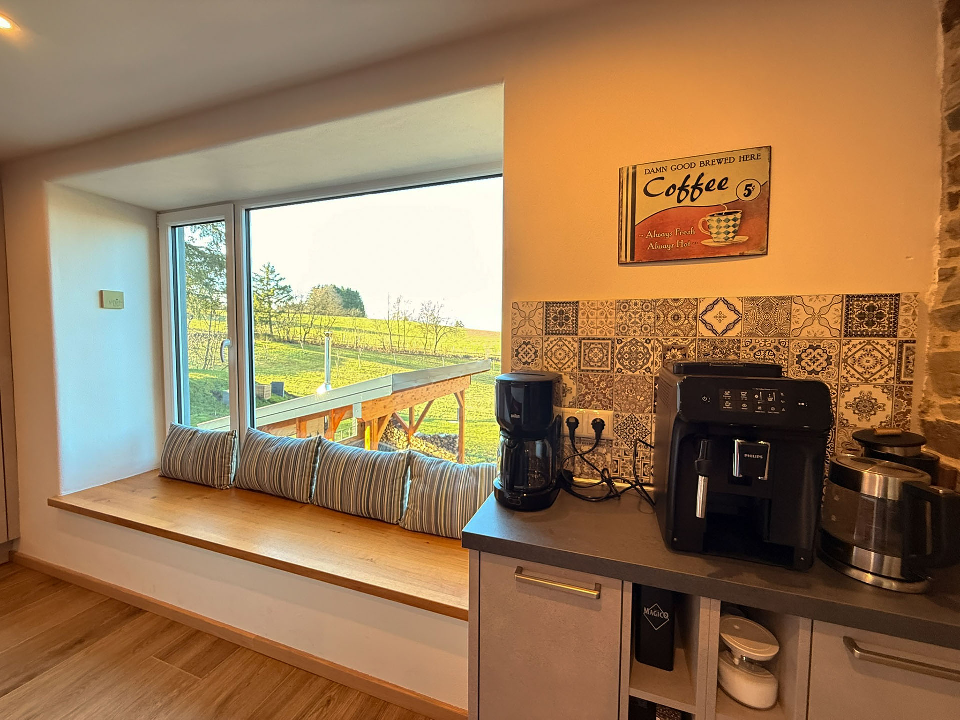 Integriert im offenen Wohnbereich ist hier einer der vielen Orte für gemeinsame Aktivitäten. Bei einem Espresso oder Caffè Crema, Spaghetti aglio e olio oder einem kleinen Kochevent – hier können Sie sich rundum wohlfühlen. Egal, ob Sie an der kleinen Bar sitzen, beim Zubereiten helfen oder auf der Fensterbank bei einem Glas Wein sitzen: hier macht Kochen und Schlemmen Spaß. Sie wählen, ob Sie den Komfort elektrischer Geräte nutzen wollen oder nicht. Backofen, Cerankochfeld (keine Induktion), Abzugshaube, Spülmaschine, Kühl- und Gefrierschrank sowie Mikrowelle, Wasserkocher, Kaffeemaschine, Brotschneidemaschine und Toaster und vieles mehr ist für Sie da. Viele softclose Schubladen bieten ausreichend Platz für Ihre mitgebrachten Vorräte. Mit reichlich Geschirr, Pfannen, Kochtöpfe- und Utensilien ausgerüstet, wird das Kochen und Servieren zum Highlight Ihres Aufenthalts.