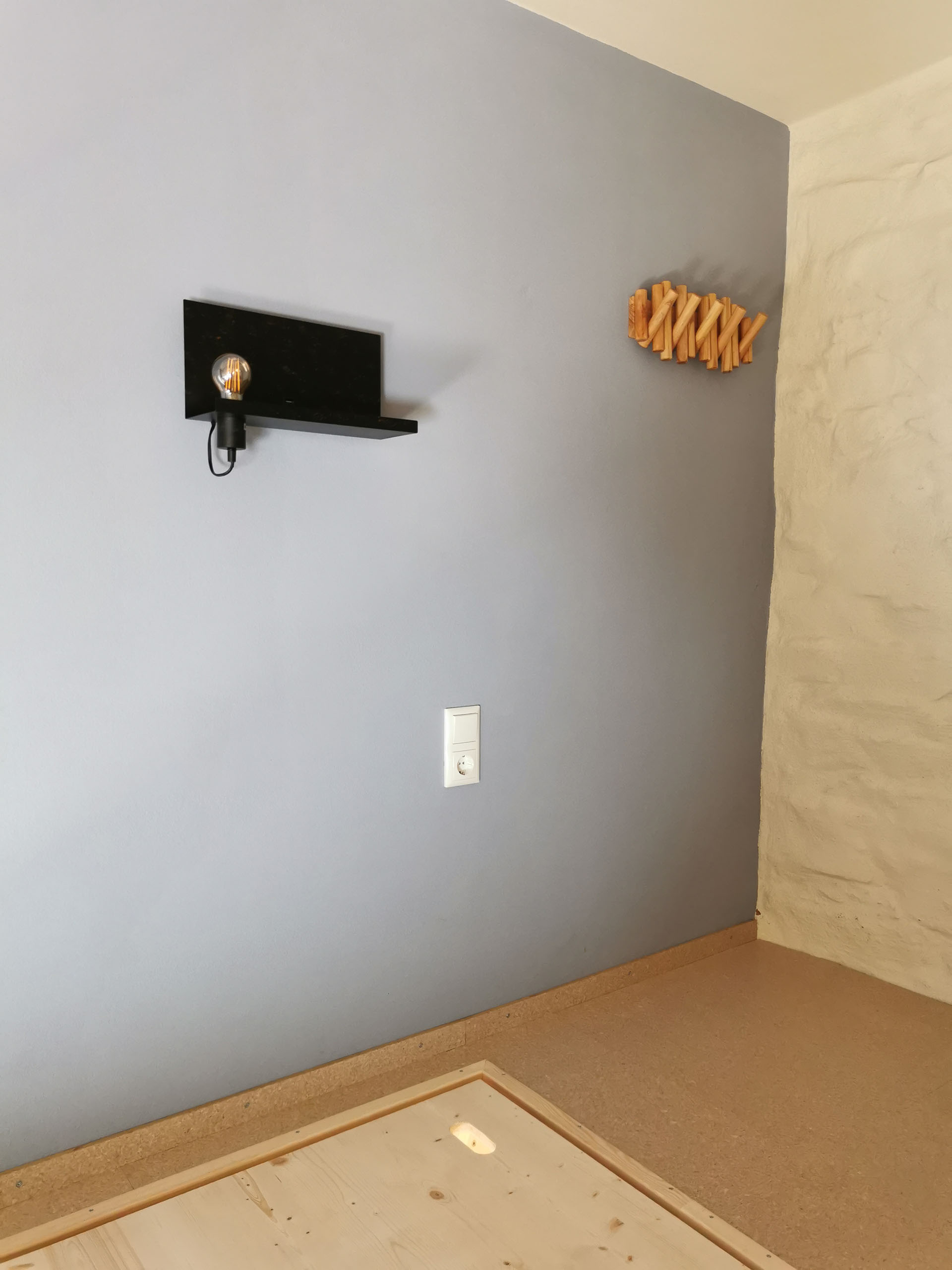 Wie eine kuschelige Höhle mit hoher Decke mutet dieses Zimmer mit sichtbarem Lehmputz und Holzboden an. Das große Boxspringbett mit hautfreundlicher Bettwäsche bezogen ist für Allergiker geeignet. Eine Kommode, Nachtischablage, Garderobe sowie Kofferablage bieten Platz für Kleidung und Persönliches. Vom Bett aus schauen Sie direkt in den Himmel – oder genießen bei Bedarf absolute Dunkelheit dank der solargesteuerten Rollos.