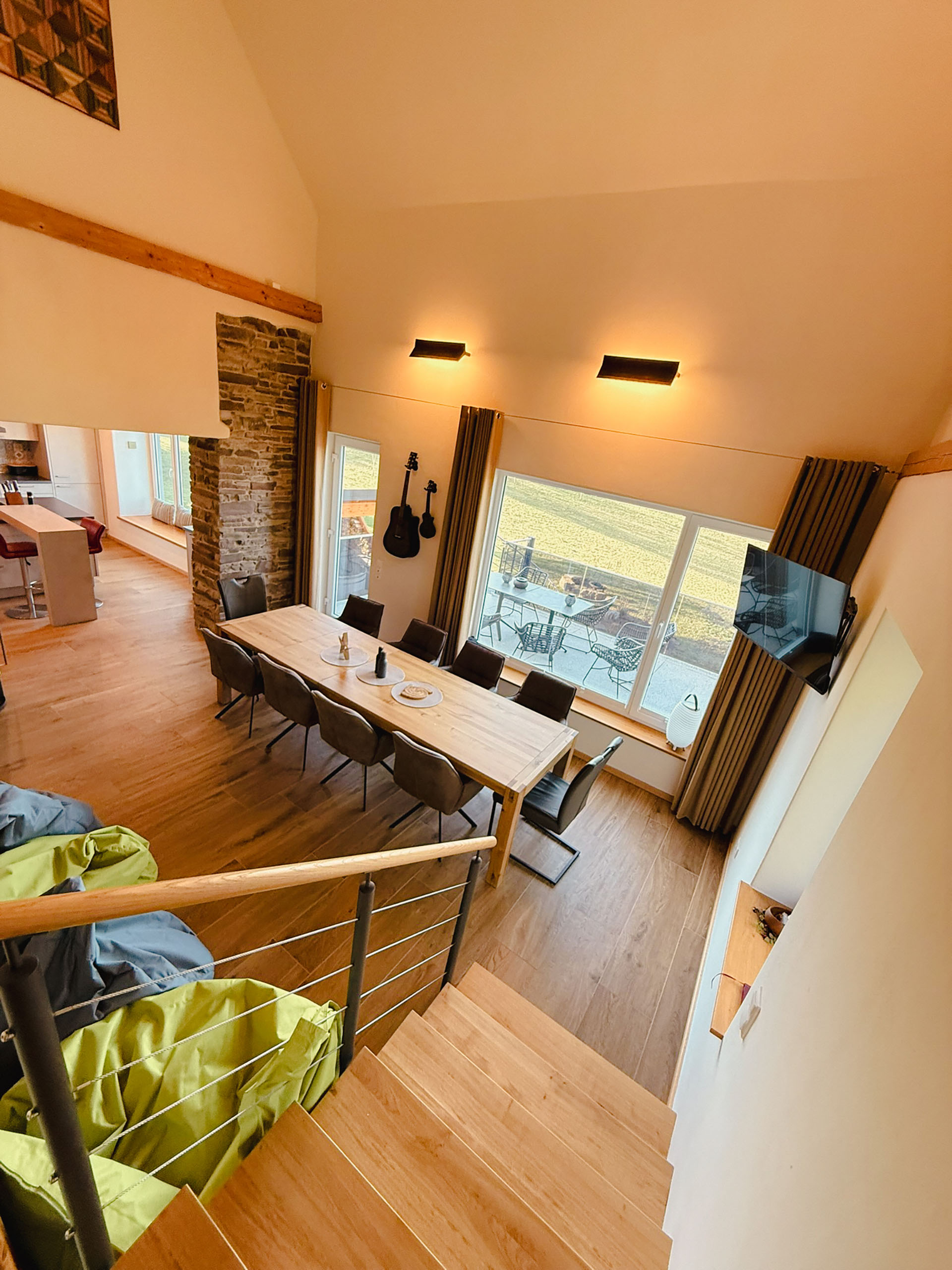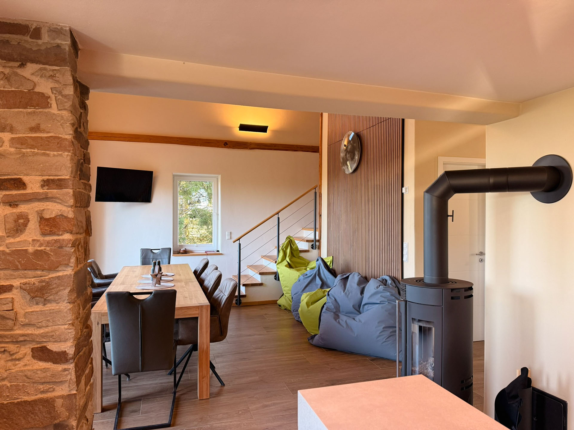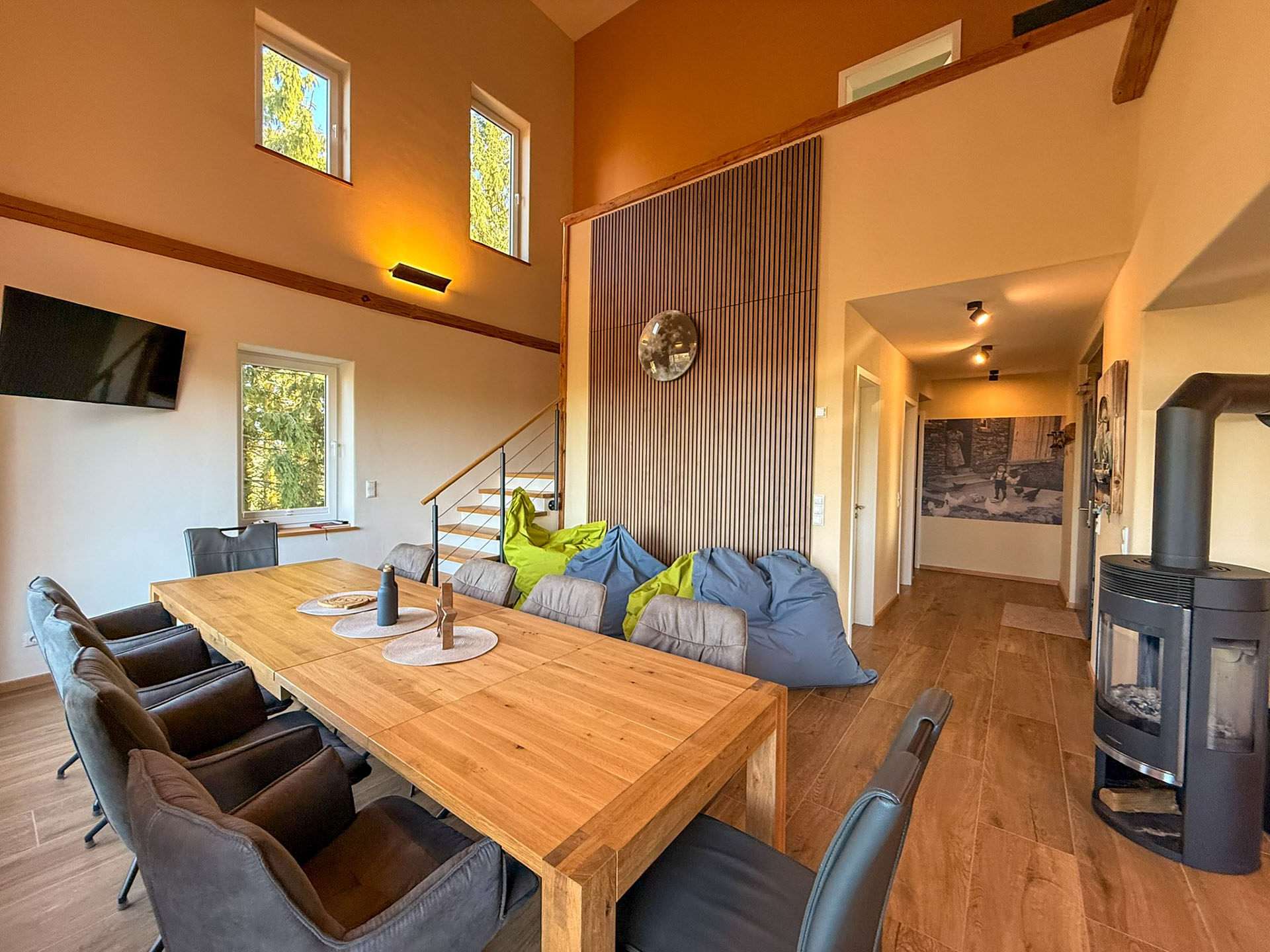 Ein massiver Holztisch für 10 Personen umrahmt von Sitzsäcken lädt zum Verbleiben ein. Ob vor dem Holzkaminofen zu fläzen, die Aussicht einfach zu genießen, Musik über die Soundbar zu hören oder gemütlich miteinander zu frühstücken, alles ist auf Ihr persönliches Wohlbefinden ausgerichtet. Und selbstverständlich können hier gemeinsam Filme oder Ereignisse auf dem Smart-TV verfolgt werden.