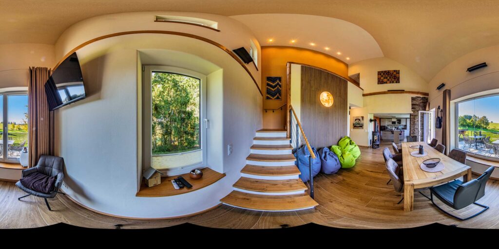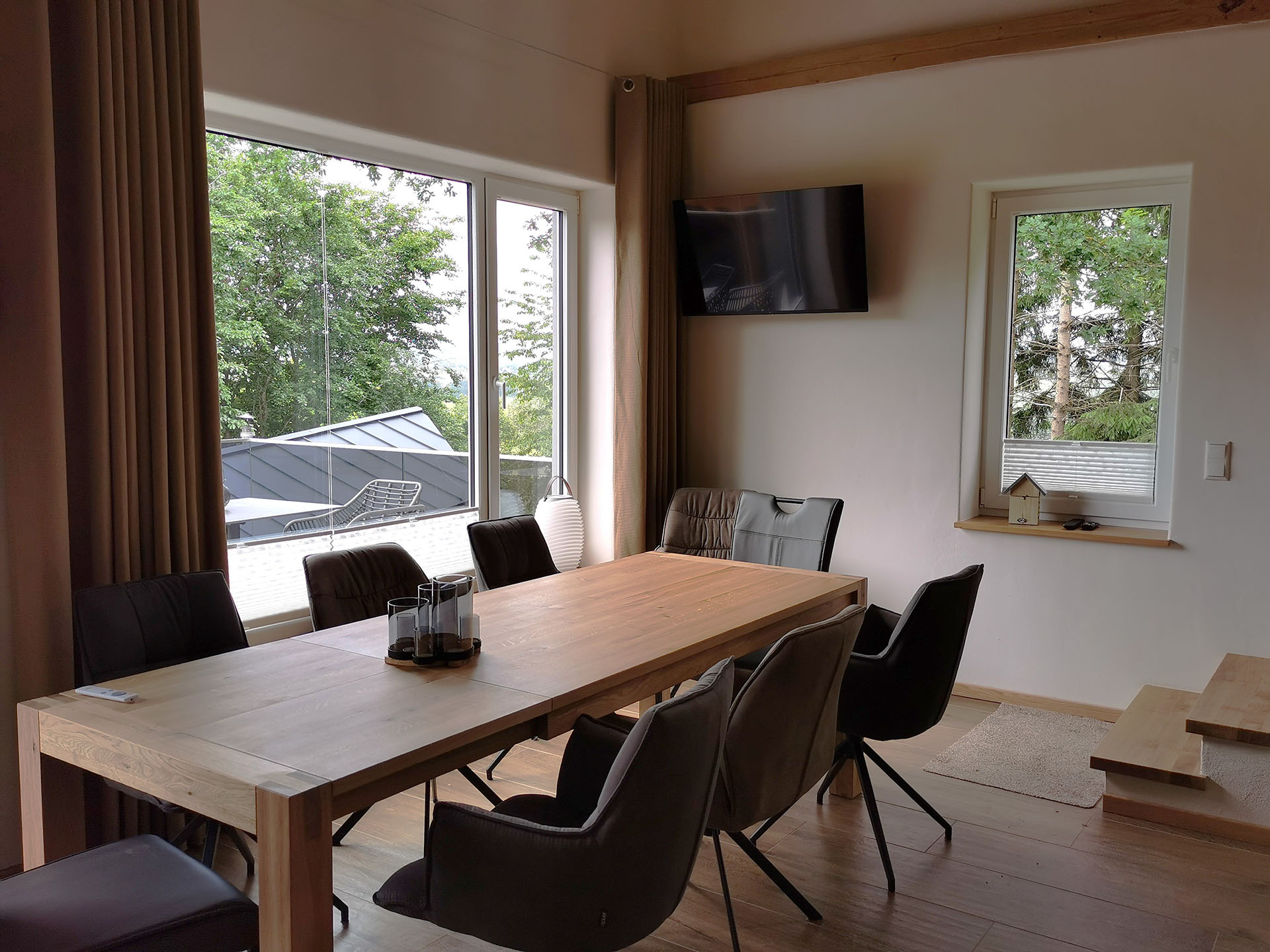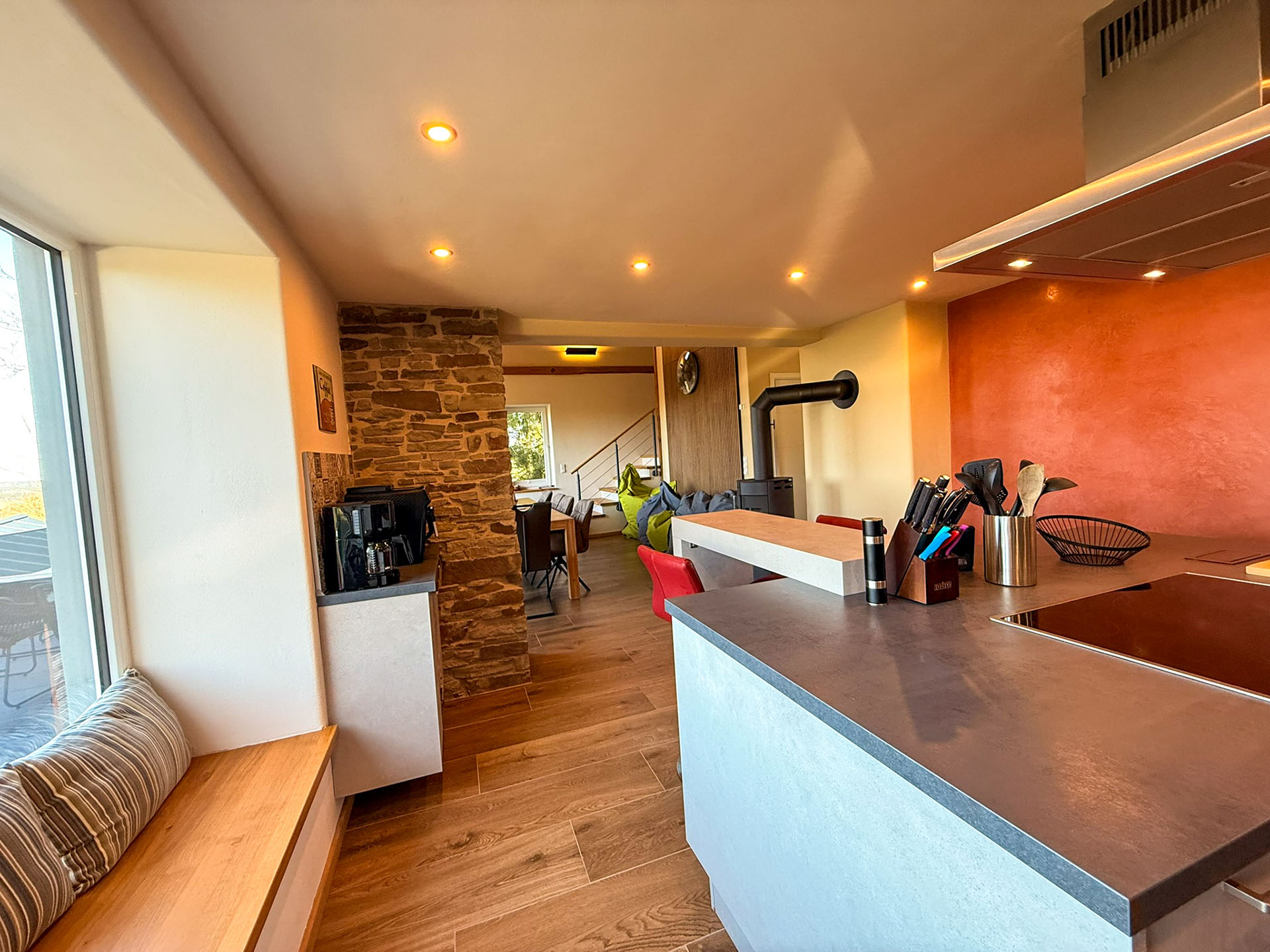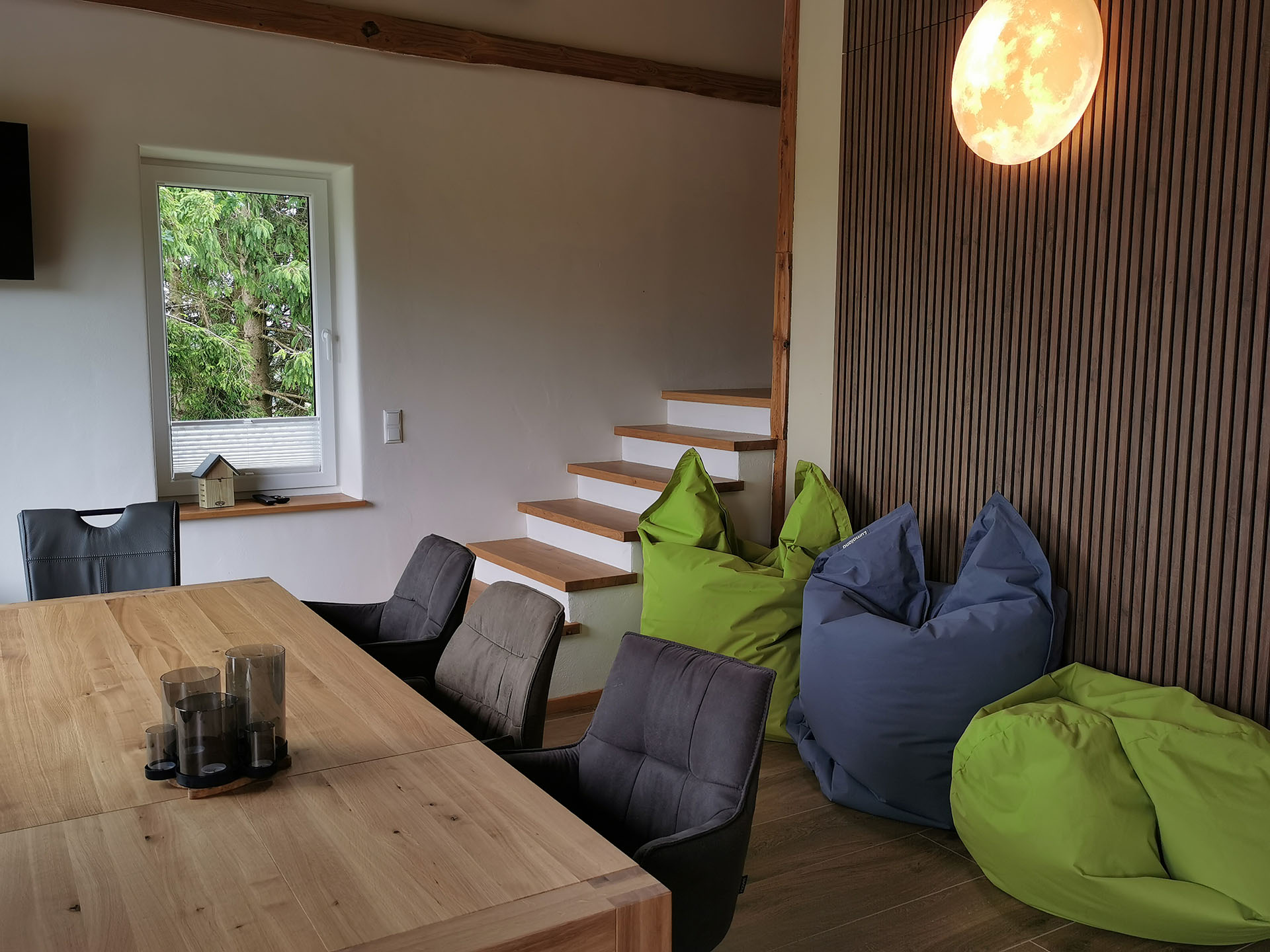 Ein massiver Holztisch für 10 Personen umrahmt von Sitzsäcken lädt zum Verbleiben ein. Ob vor dem Holzkaminofen zu fläzen, die Aussicht einfach zu genießen, Musik über die Soundbar zu hören oder gemütlich miteinander zu frühstücken, alles ist auf Ihr persönliches Wohlbefinden ausgerichtet. Und selbstverständlich können hier gemeinsam Filme oder Ereignisse auf dem Smart-TV verfolgt werden.