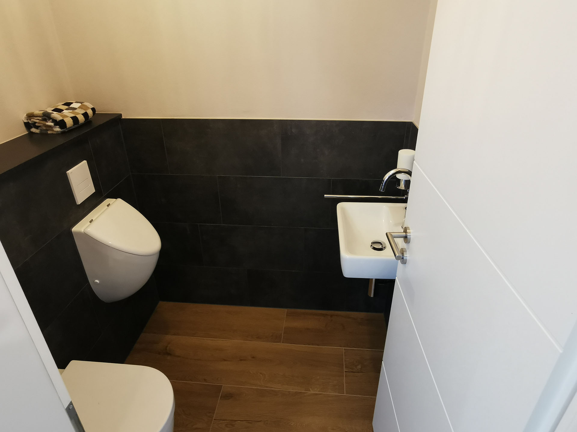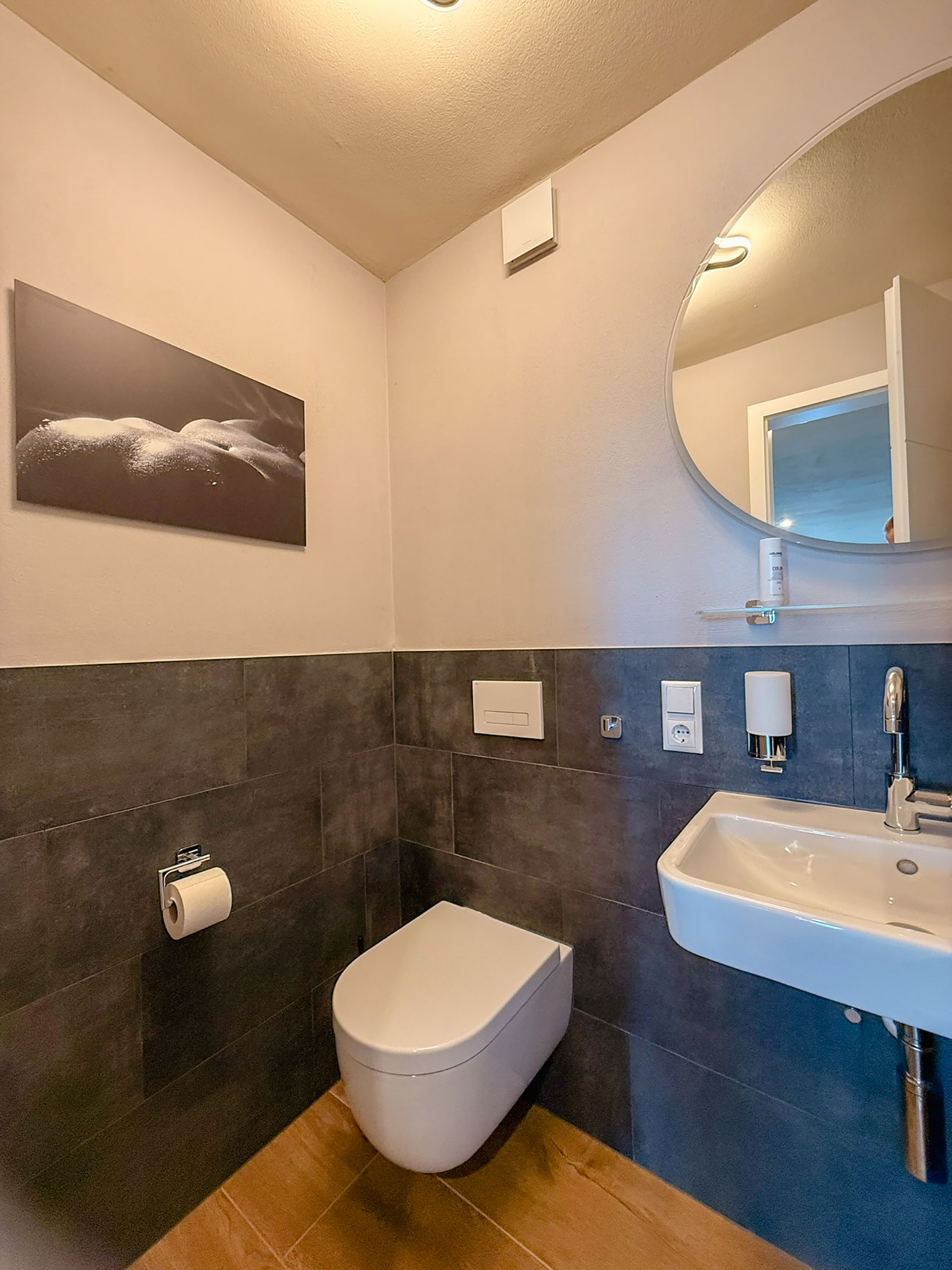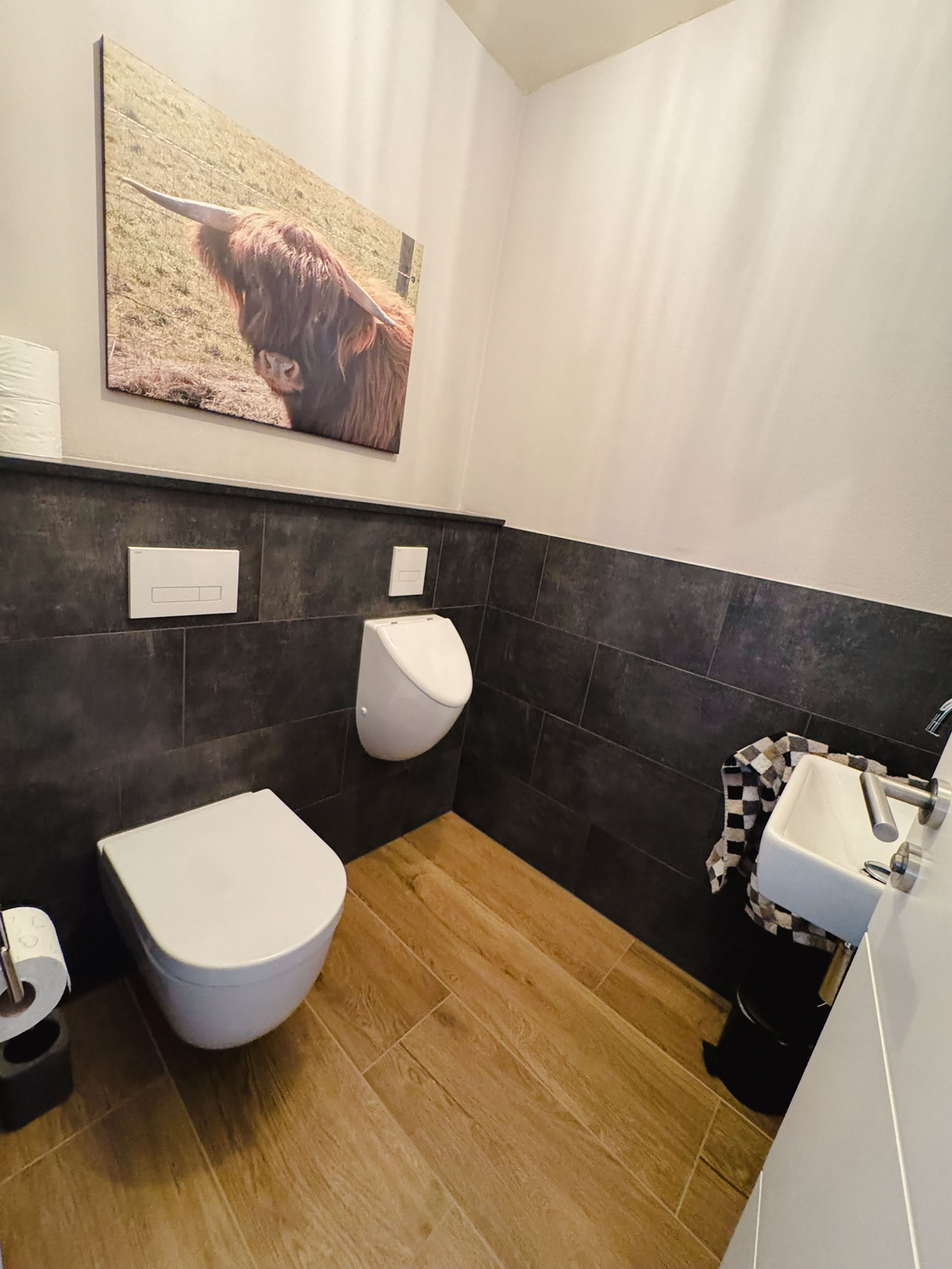 Hier können Sie Ihren Alltag an der Garderobe ablegen und für einige Tage in eine unbeschwerte Zeit abtauchen. Die Toilette ist zentral im Erdgeschoß bequem und schnell erreichbar. Handwaschbecken, Toilette, Urinal sowie Ablage, Handtücher und Abfallbehälter garantieren für die Hygienebedürfnisse aller Gäste.