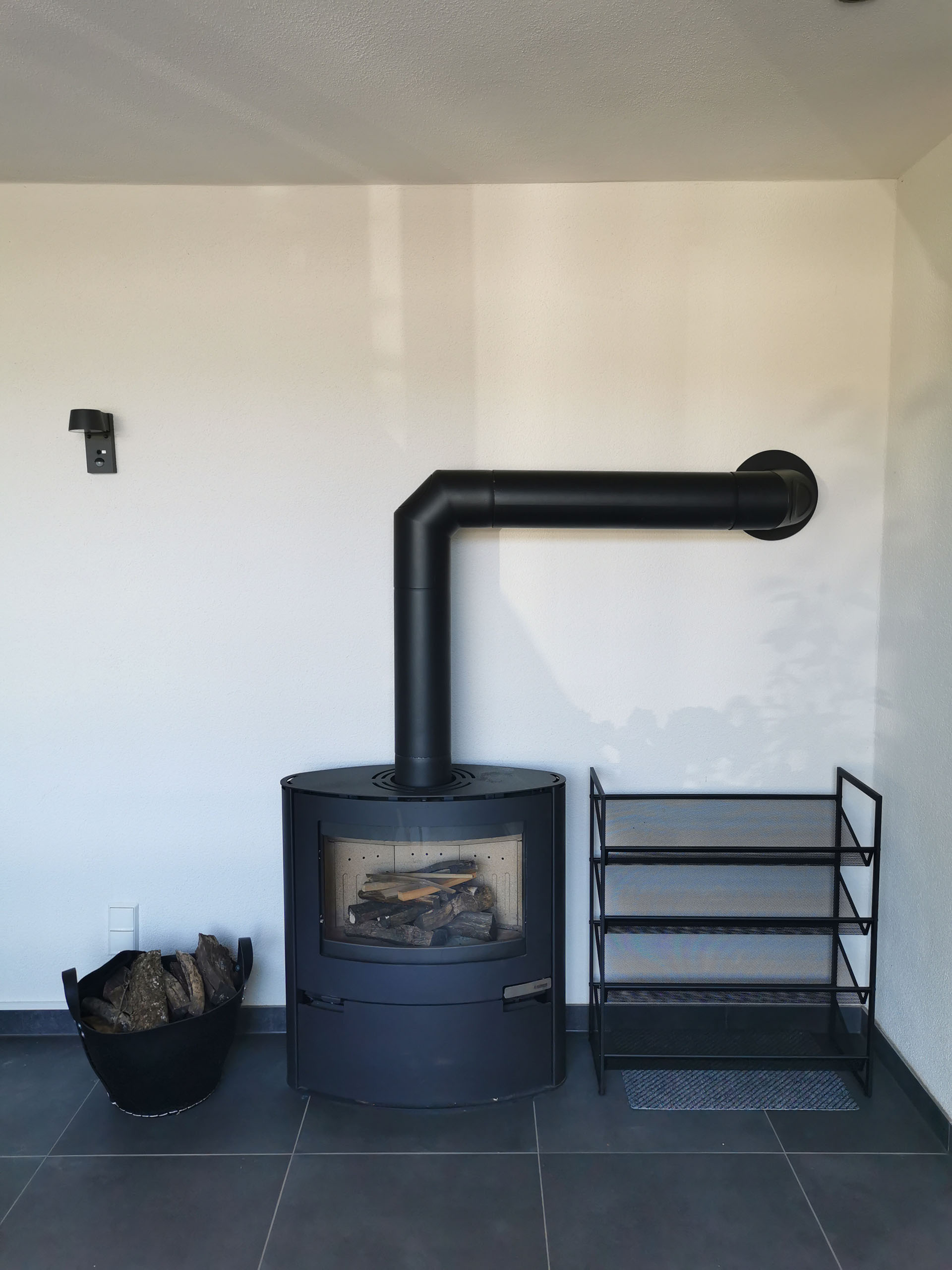 mit Holzvorrat und Kaminbesteck