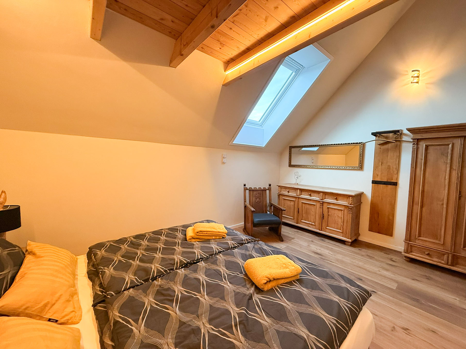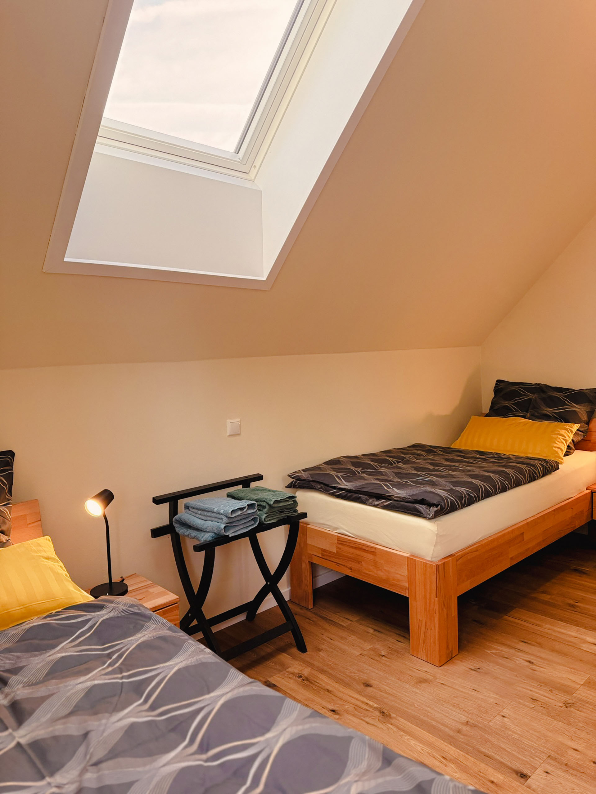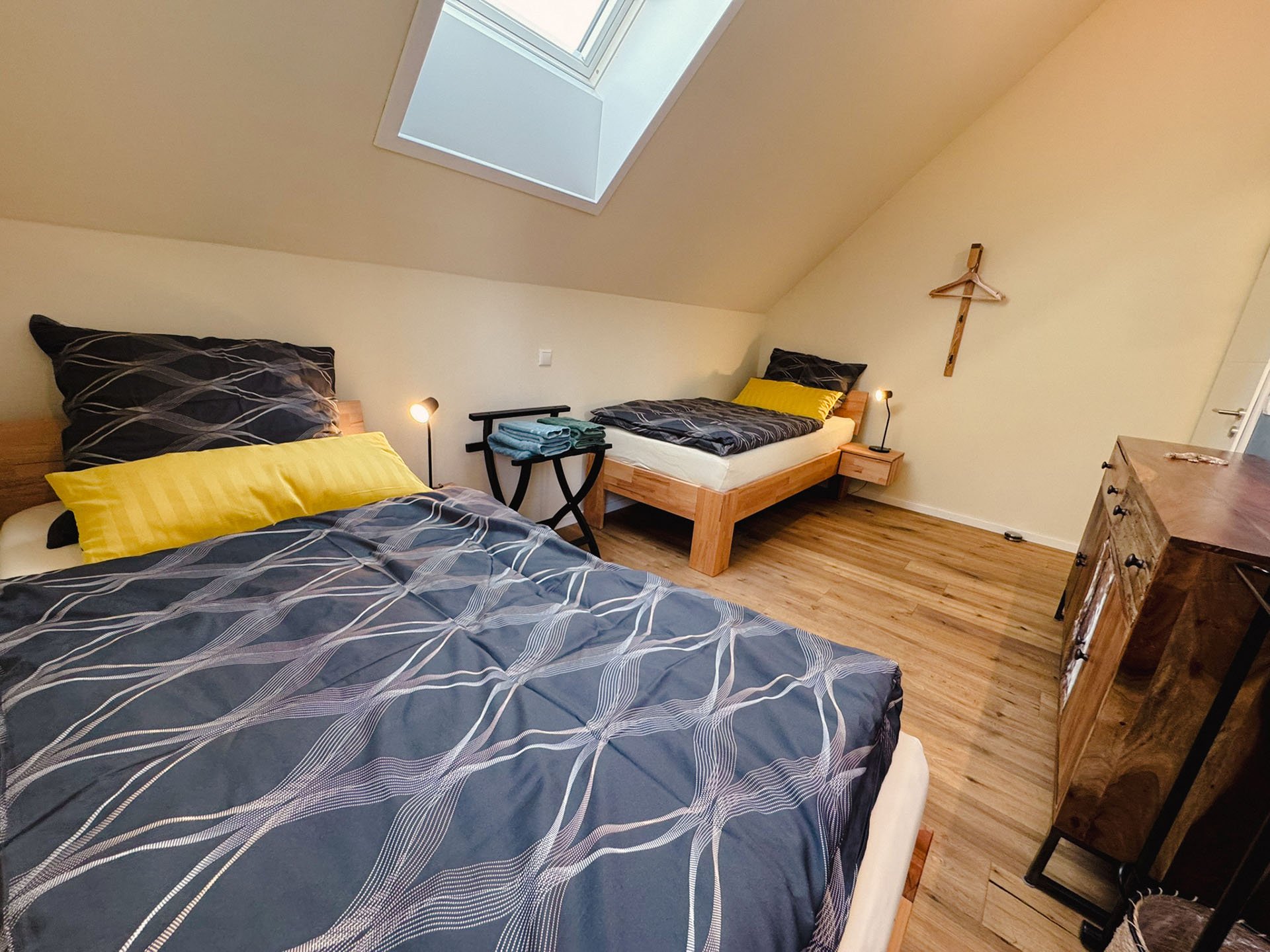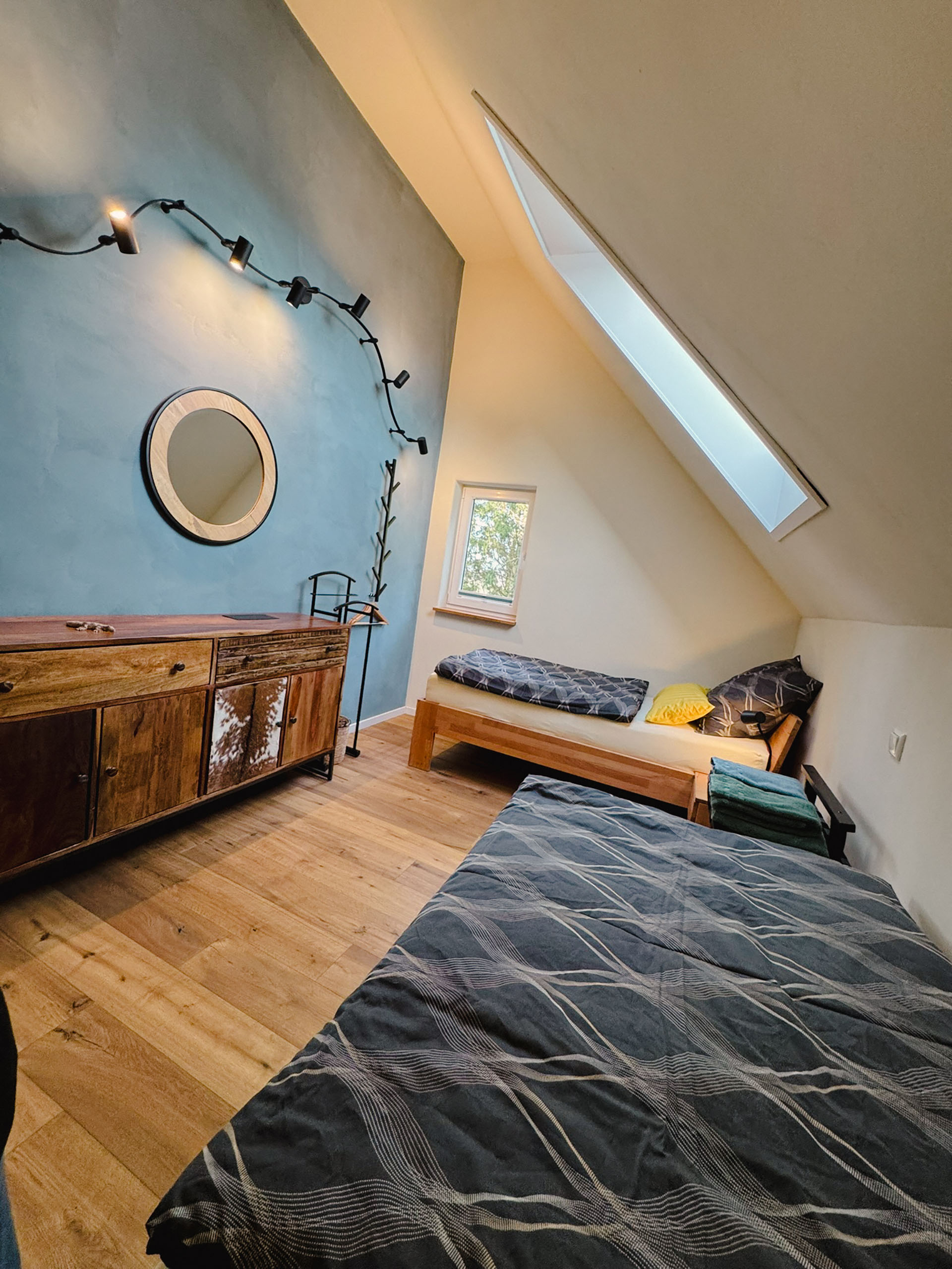 Ideal für Freunde, Geschwister oder alle, die getrennt schlafen möchten – und dabei nicht auf Gemütlichkeit verzichten wollen. Zwei hochwertige Einzelbetten, charmante Möbelstücke aus Massivholz und eine stilvolle Einrichtung schaffen ein einladendes Ambiente, das Ruhe und Wärme ausstrahlt. Solarbetriebene Rollos ermöglichen zudem eine vollständige Verdunkelung – für erholsamen Schlaf zu jeder Tageszeit.