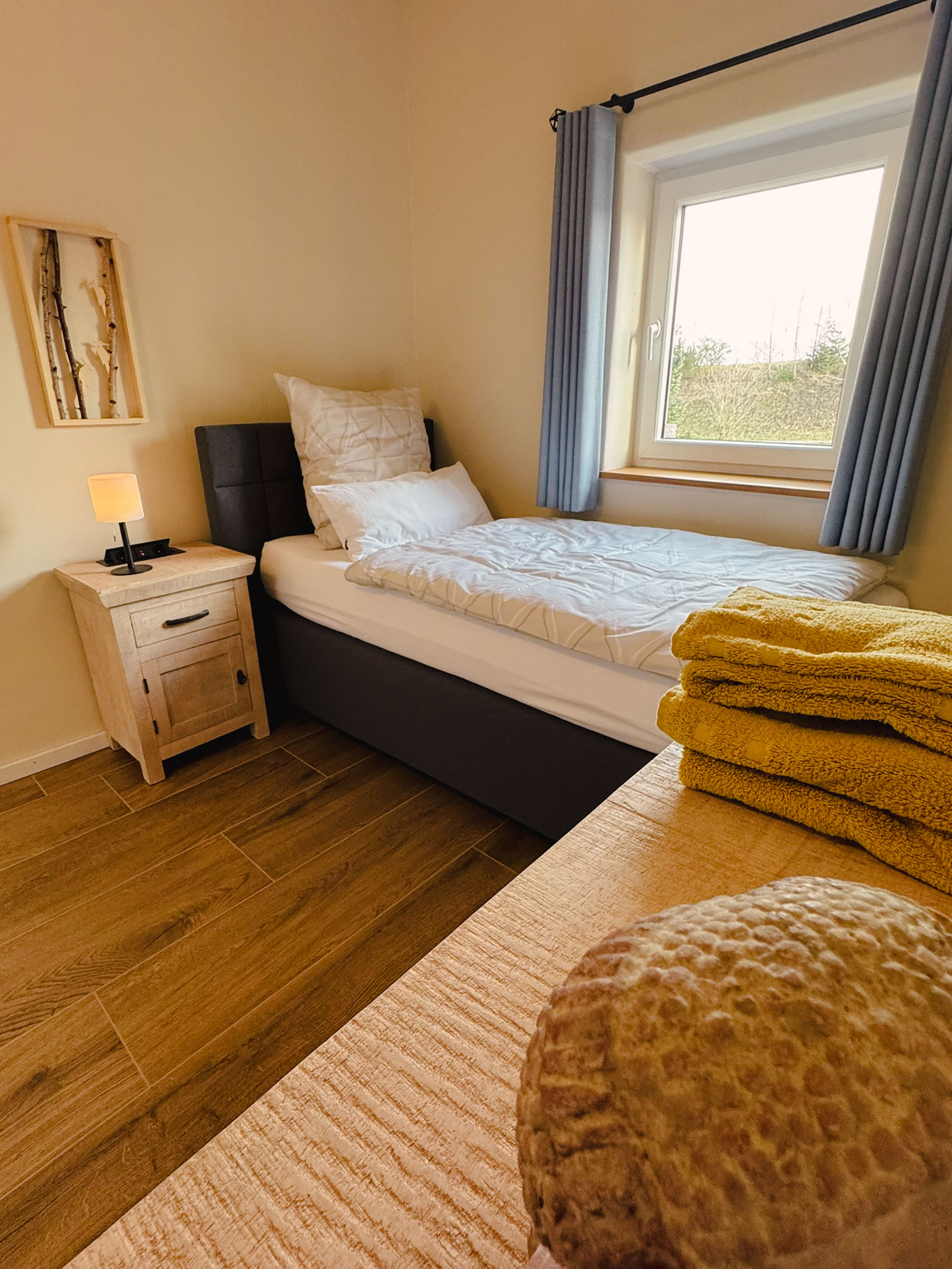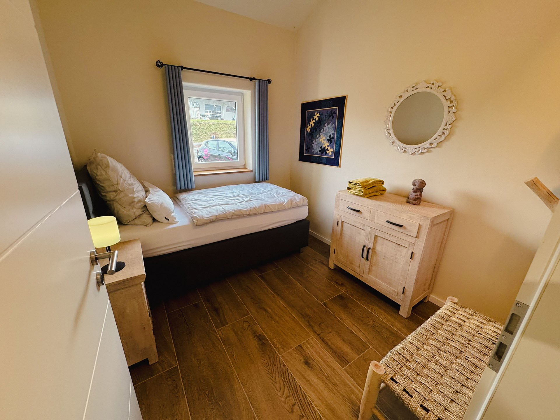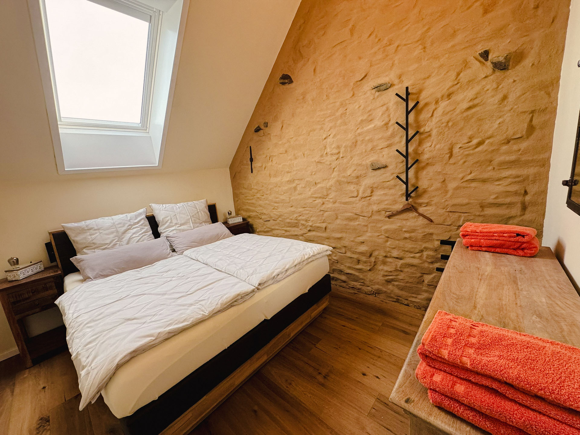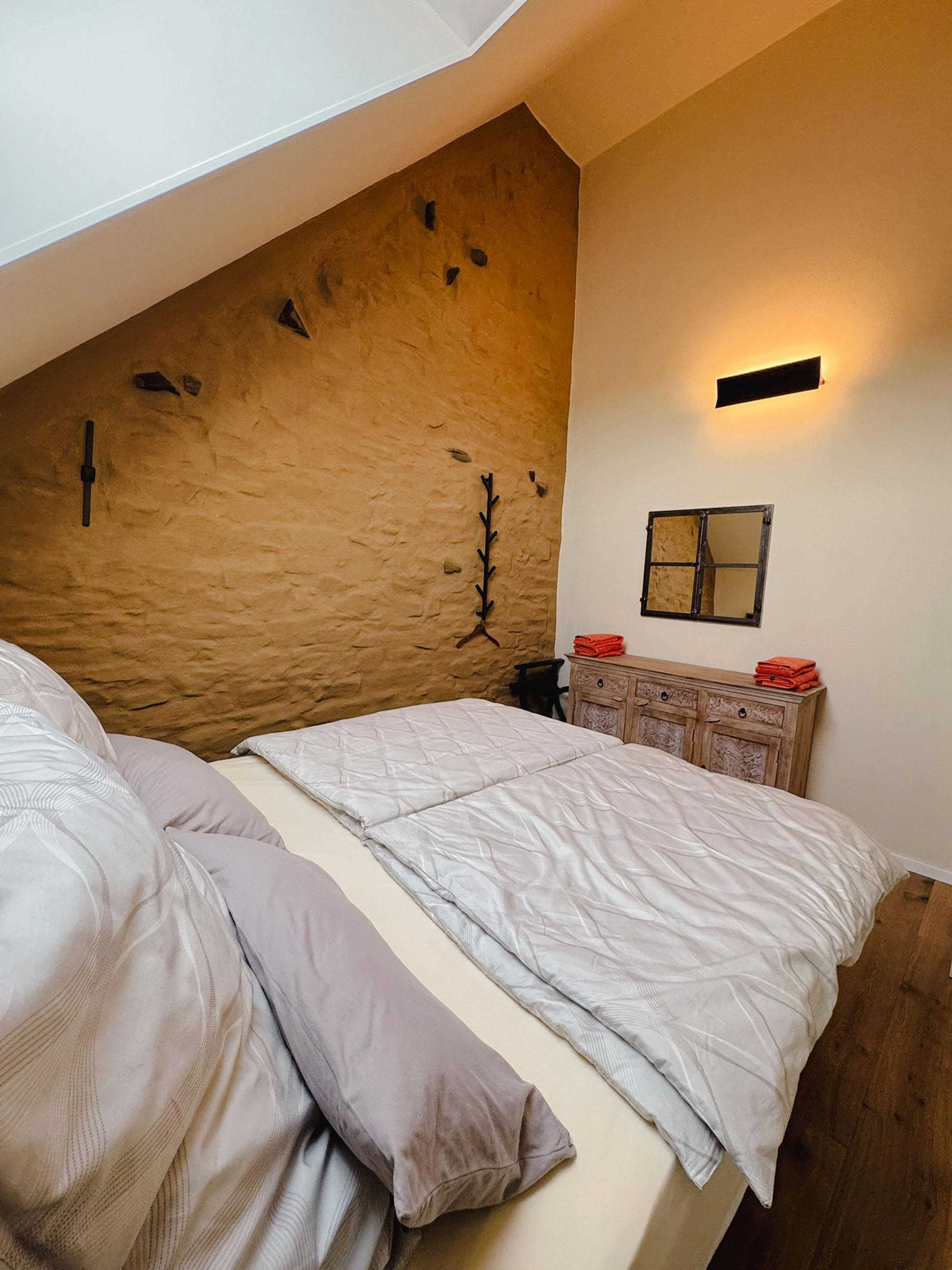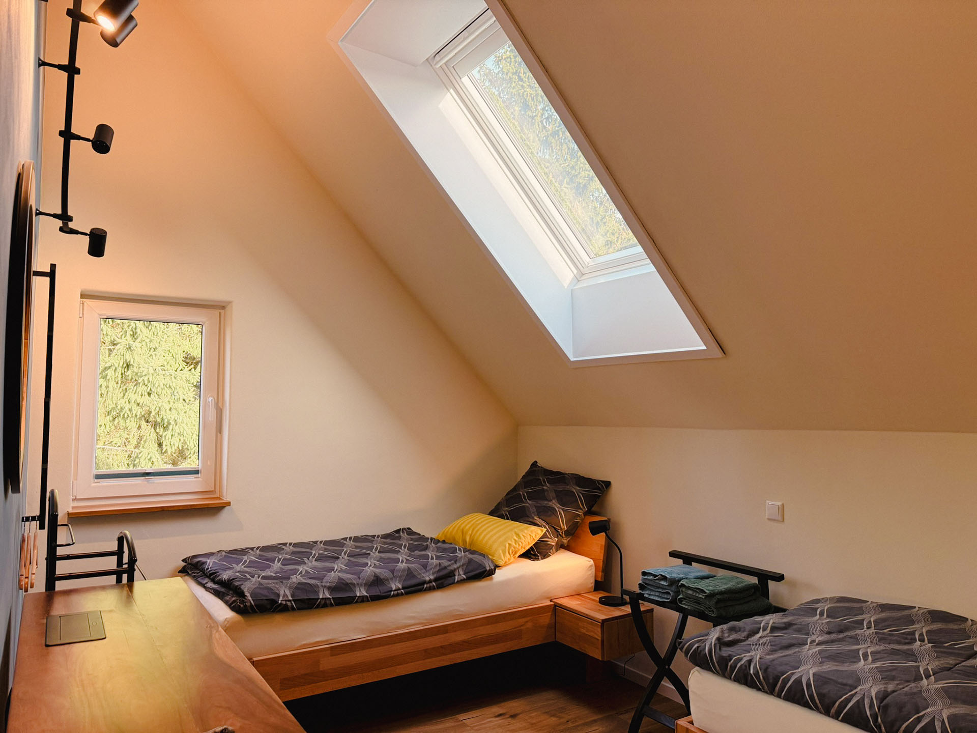 Ideal für Freunde, Geschwister oder alle, die getrennt schlafen möchten – und dabei nicht auf Gemütlichkeit verzichten wollen. Zwei hochwertige Einzelbetten, charmante Möbelstücke aus Massivholz und eine stilvolle Einrichtung schaffen ein einladendes Ambiente, das Ruhe und Wärme ausstrahlt. Solarbetriebene Rollos ermöglichen zudem eine vollständige Verdunkelung – für erholsamen Schlaf zu jeder Tageszeit.