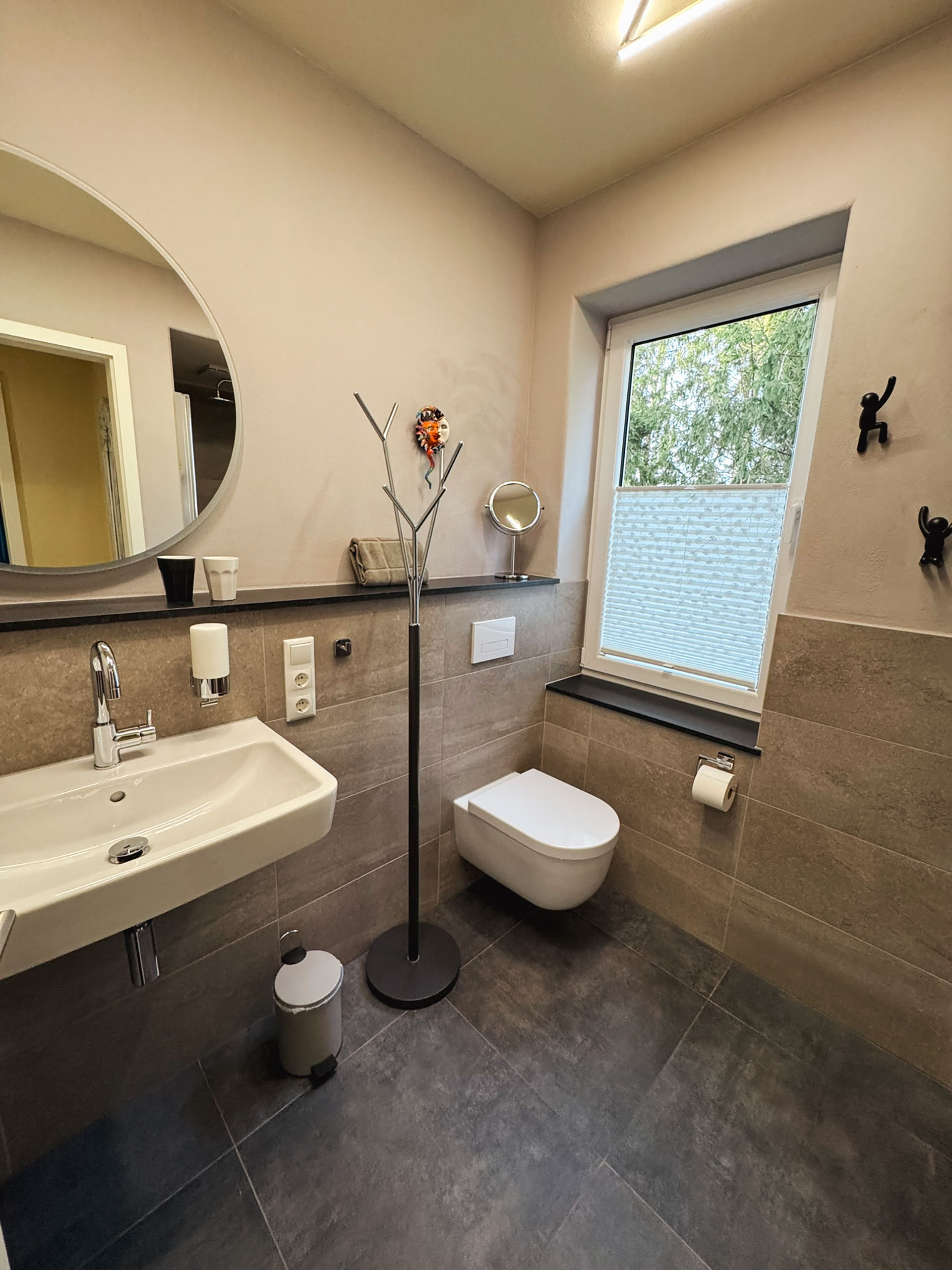 Genießen Sie Komfort und Design in einem barrierefreien Badezimmer mit Fenster zum Wald, ausgestattet mit Regendusche und Handbrause, Waschbecken mit beleuchtetem Spiegel und Toilette. Die Natursteinablage sowie reichlich vorhandene Handtuchhalter und Kleiderhaken ergänzen die bequeme Nutzung für die Gäste im Einzelzimmer.