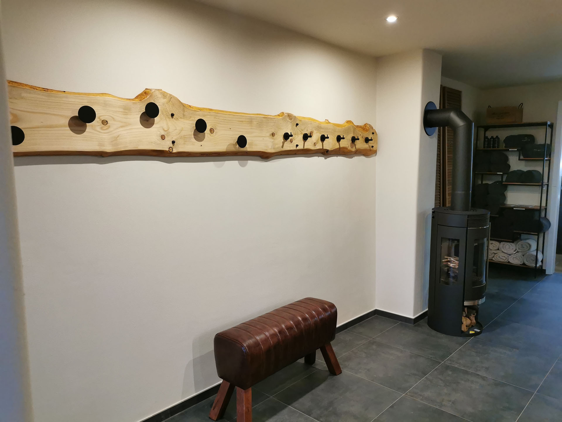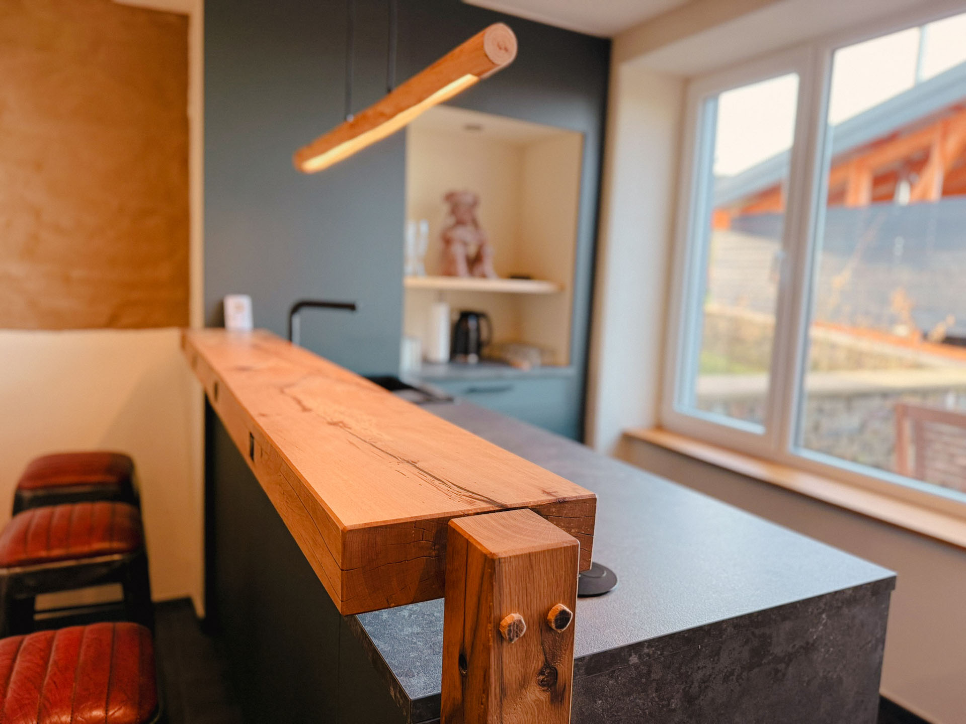 Hier können Sie nach dem Hot Tub- oder Saunagang wieder regenerieren. Die Theke, aus Vater Johann‘s alter Werkbank gefertigt, umrahmt eine perfekt ausgestattete kleine Teeküche. Getränke bleiben im Kühlschrank kalt, die kleine Spülmaschine und Spüle machen das Aufräumen leicht und schon freuen Sie sich auf den nächsten Gang!