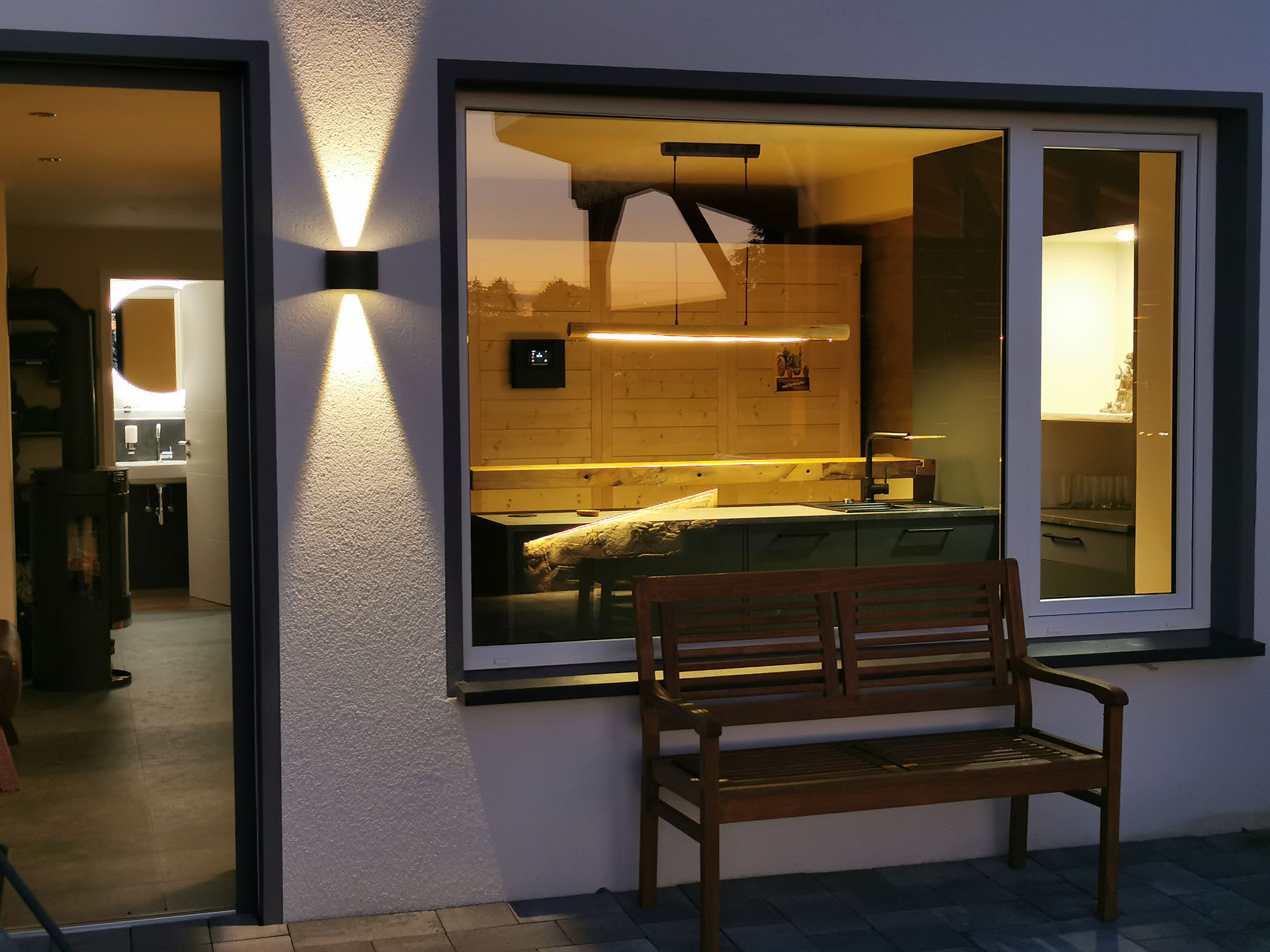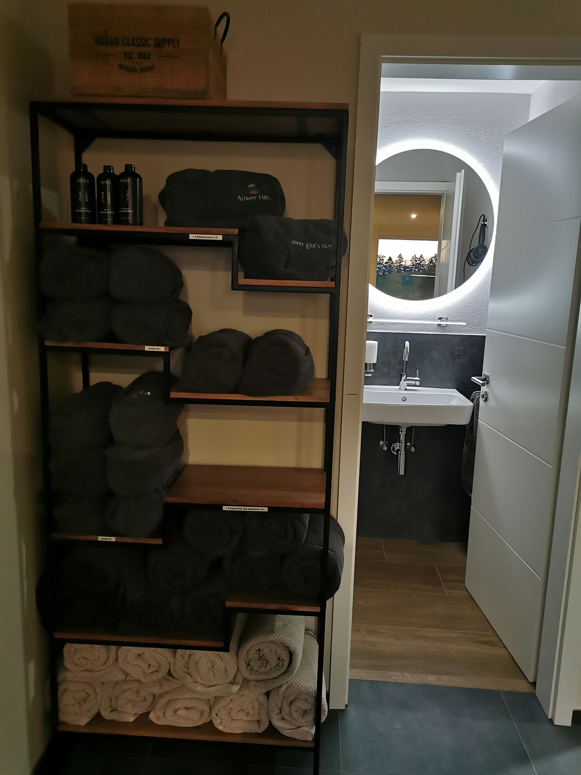 Praktisch und dezent integriert: Das separate WC mit Waschbecken und beleuchtetem Spiegel liegt direkt im Saunabereich und bietet zusätzlichen Komfort – durchdacht und immer verfügbar.