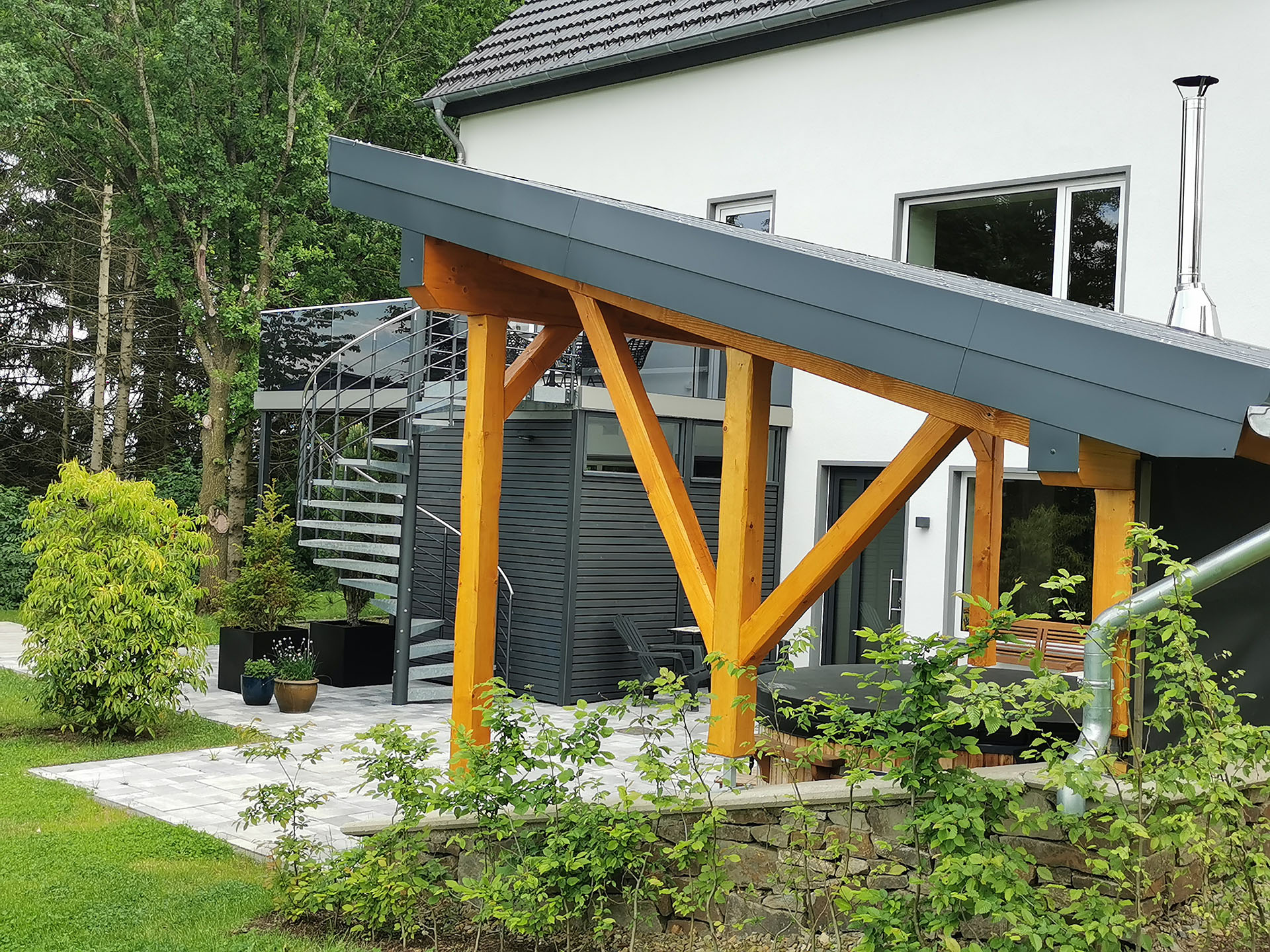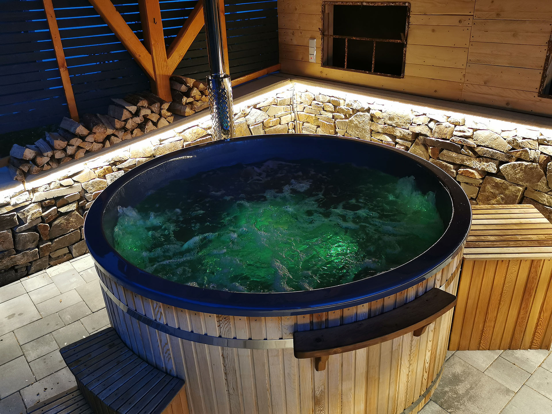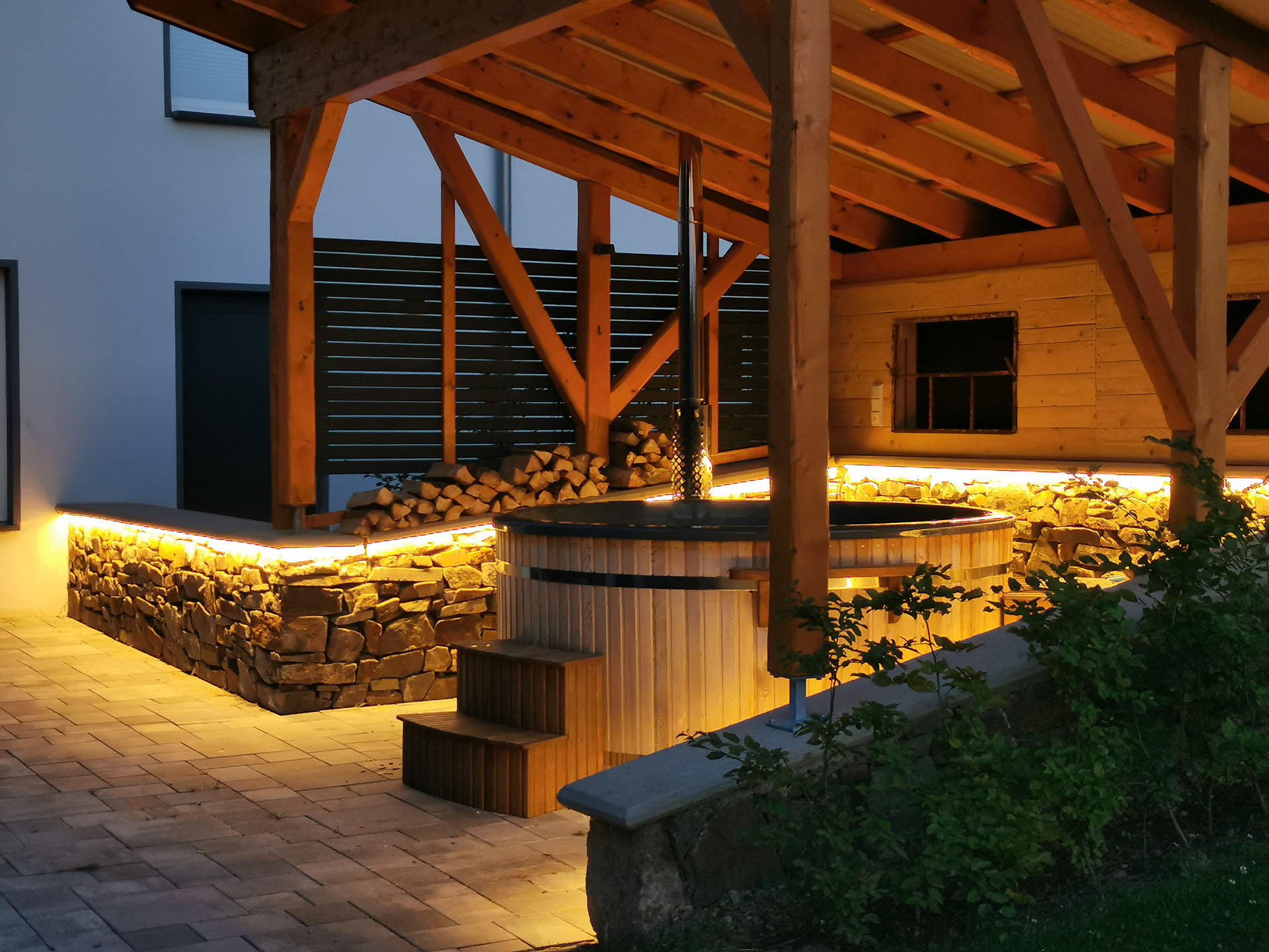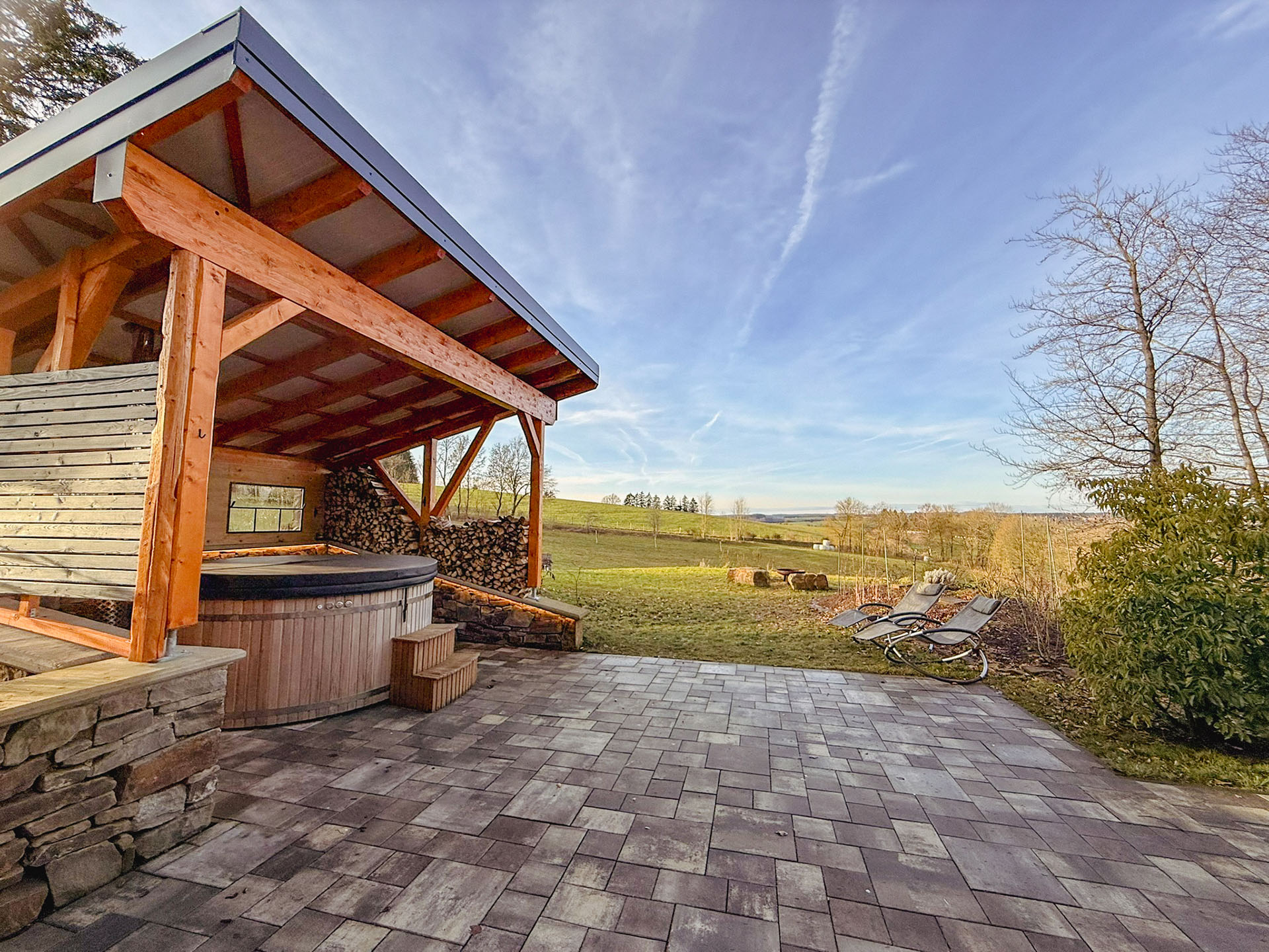 Der überdachte Hot Tub ist ein echtes Highlight – rustikal, wind- und sichtgeschützt, mit stimmungsvoller Beleuchtung und gemütlichen Liegestühlen. Im Mittelpunkt: der großzügige, holzbefeuerte Hot Tub mit Sprudelfunktion und farbiger Beleuchtung. Hier tauchen Sie ein in wohlige Wärme, umgeben von Zedernholz, knisterndem Feuer in der Feuerschale und der Ruhe der Natur. Ein besonderer Ort für unvergessliche Abende unter freiem Himmel.