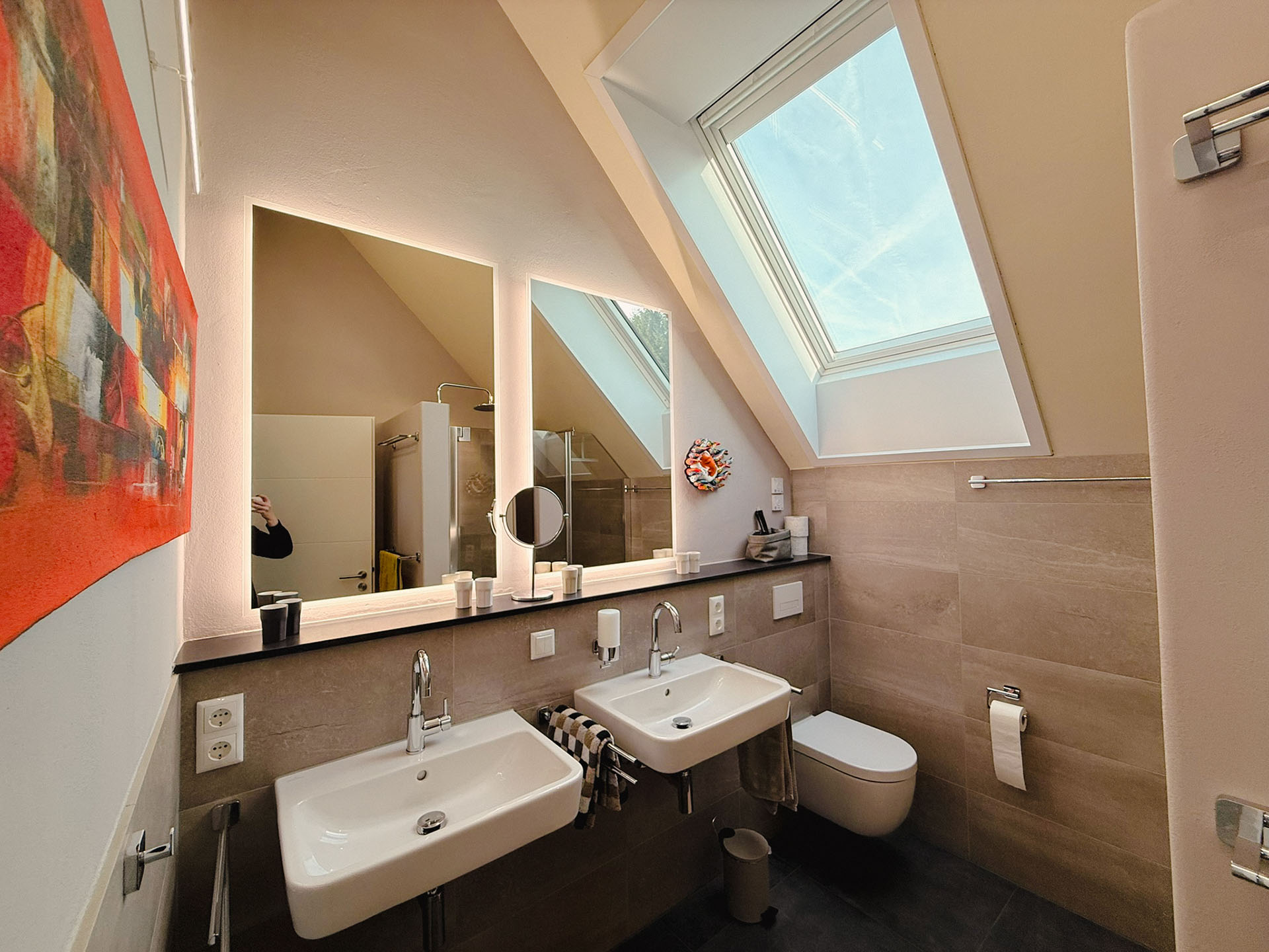 Genießen Sie Komfort und Design in einem barrierefreien Badezimmer mit solarbetriebenem Dachfenster, ausgestattet mit großer Regendusche und Handbrause, 2 Waschbecken mit beleuchteten Spiegeln und Toilette. Die Natursteinablage sowie reichlich vorhandene Handtuchhalter und Kleiderhaken ergänzen die bequeme Nutzung für die 6 bis 8 Gäste im Obergeschoß.