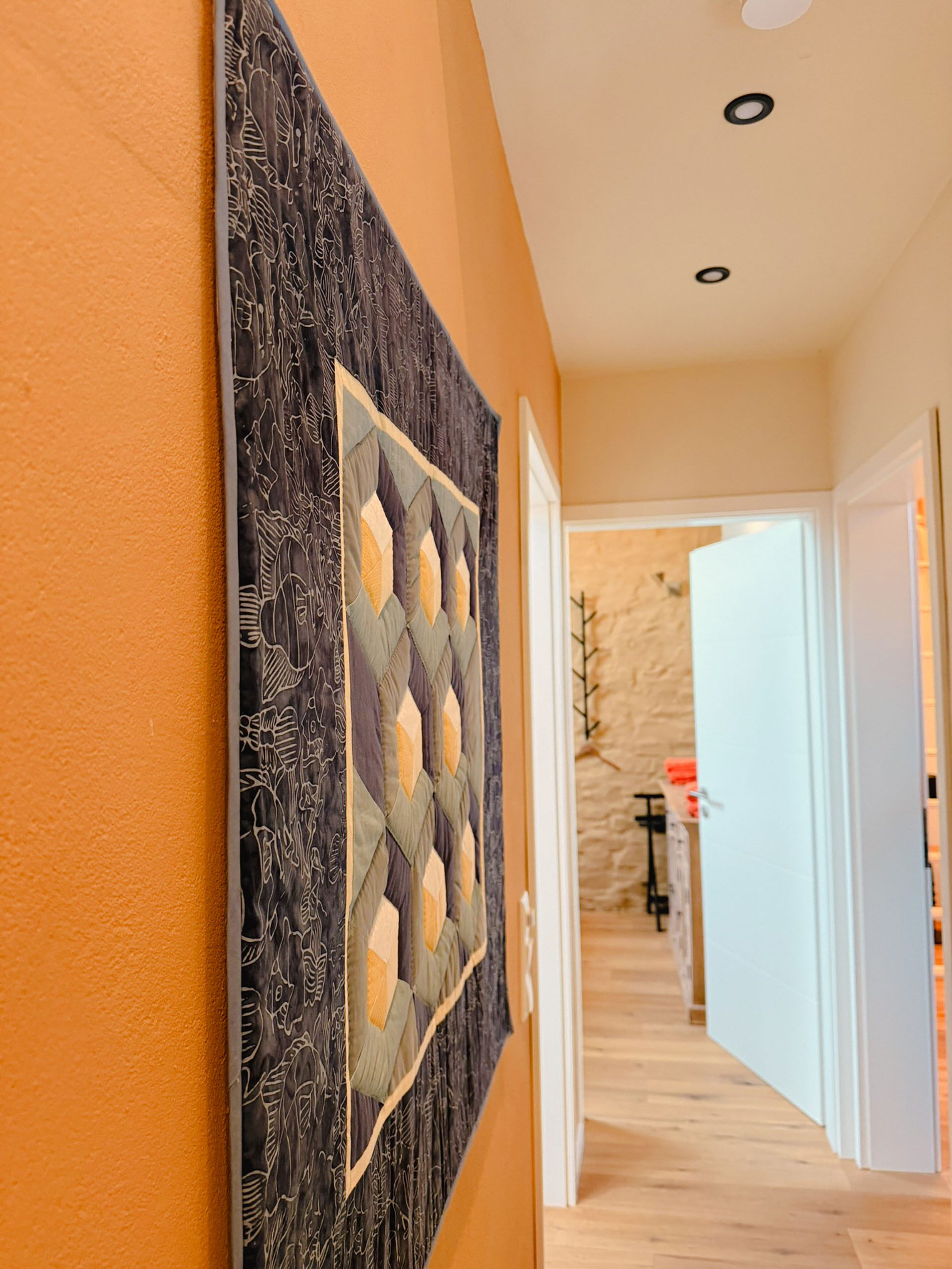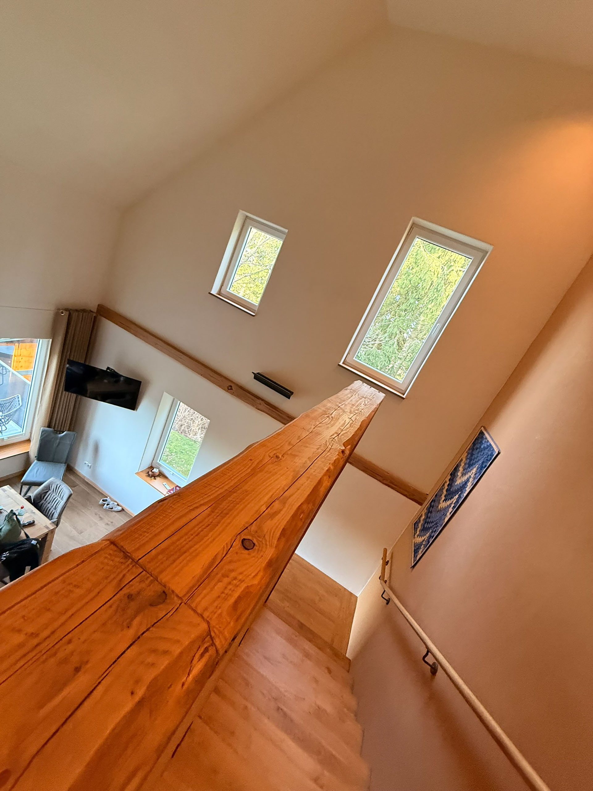 Über die Massivholztreppe (auch zum Sitzen geeignet) im offenen Wohnbereich erreicht man die Galerie im Obergeschoß. Im gesamten Obergeschoß, ausgenommen im Duschbad, ist Eichenparkett verlegt. Straßenschuhe sind hier nicht willkommen, dafür umso mehr Barfüßler! Von der Galerie aus ist die Innenarchitektur der ehemaligen Scheune gut erahnbar.