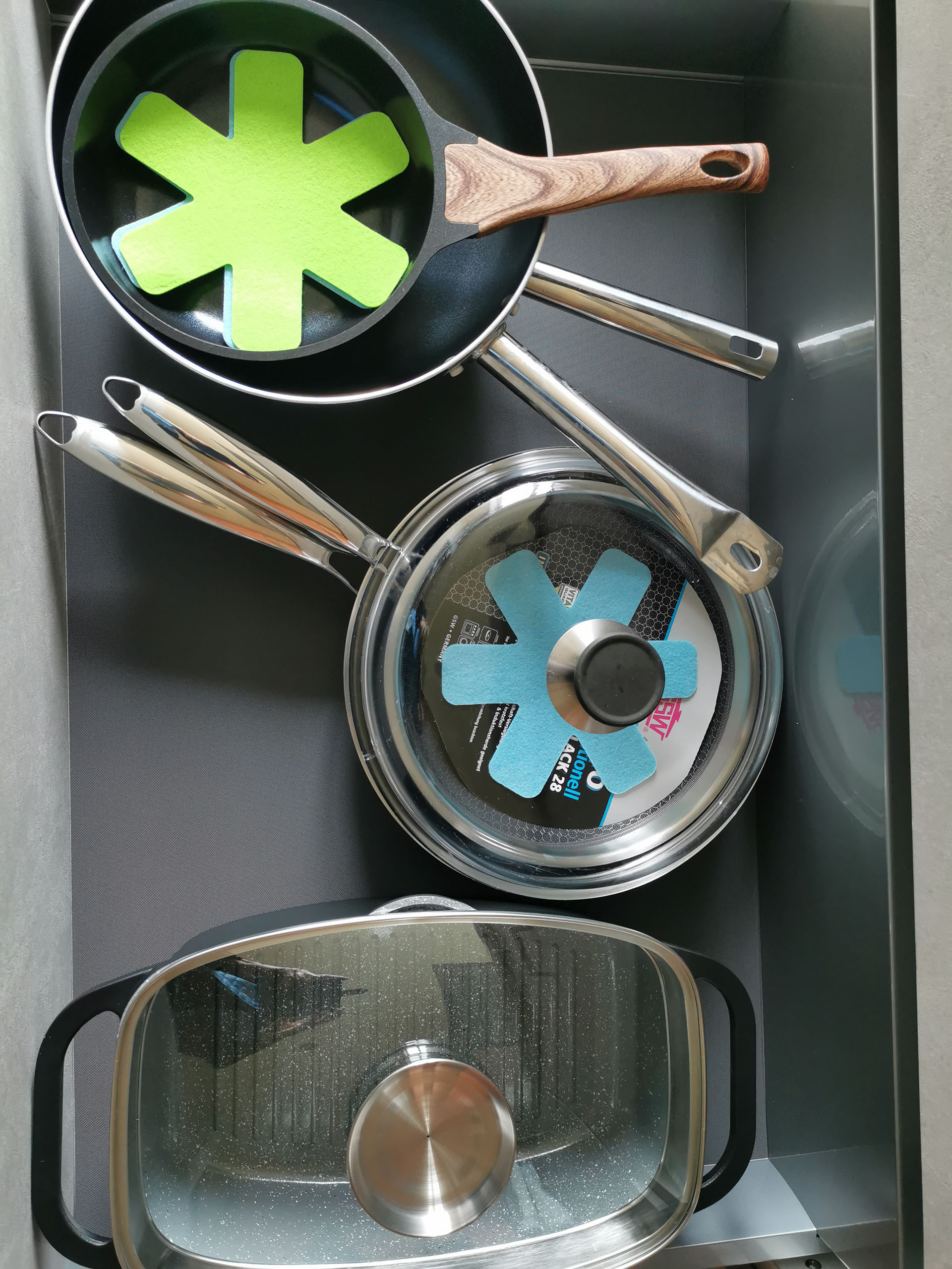 Hier ist die Wohnungswirtschaft untergebracht. Akku-Staubsauger, Kehrblech und Besen, Regal für Kissen und Outdoordecken, Putzeimer mit Putzmittel und Erste-Hilfe-Kasten. Hier können auch Koffer abgestellt werden.